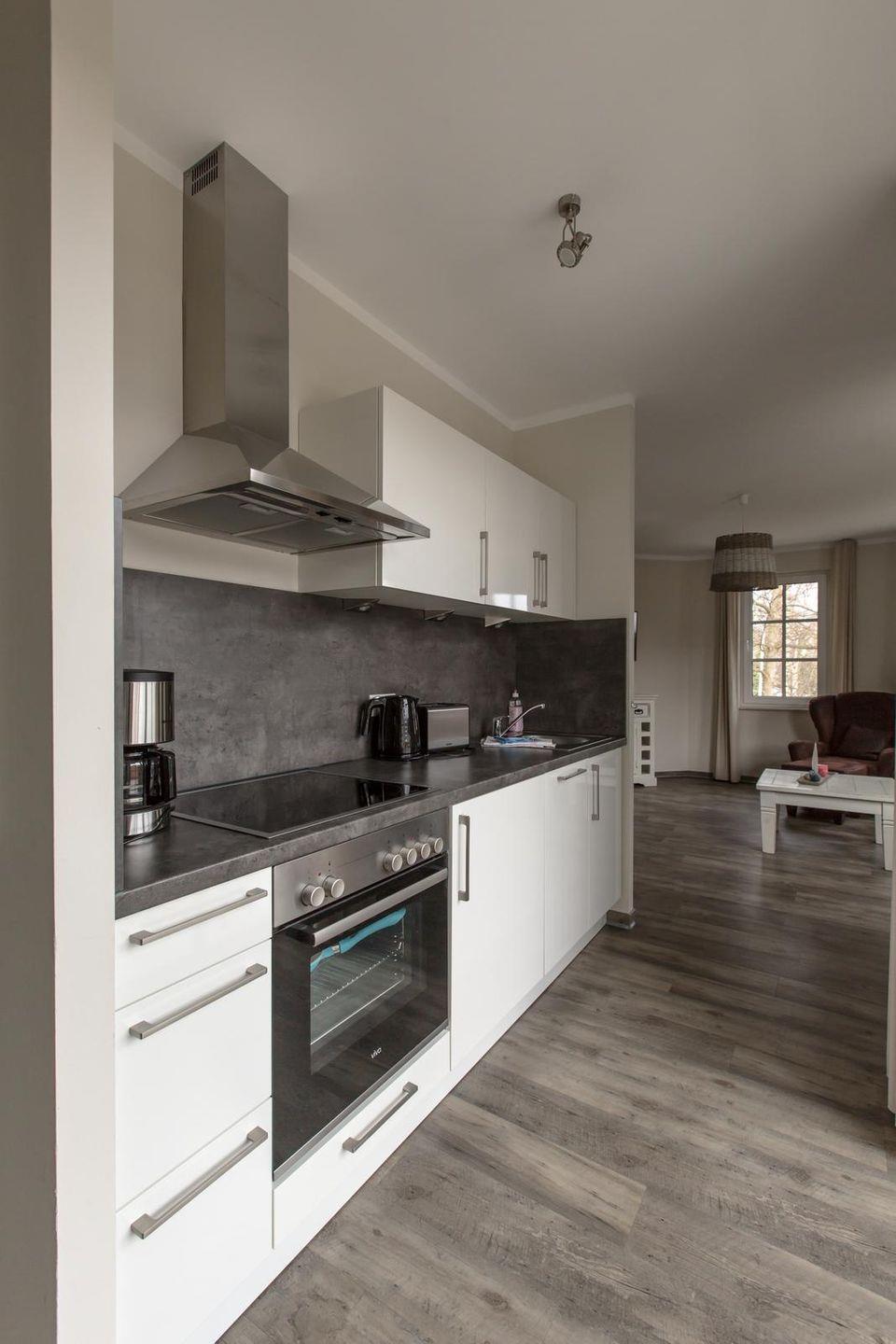Offene Küchenzeile im Wohnraum mit Ceranfeld, Backofen, Geschirrspüler, Kühlschrank mit Gefrierfach