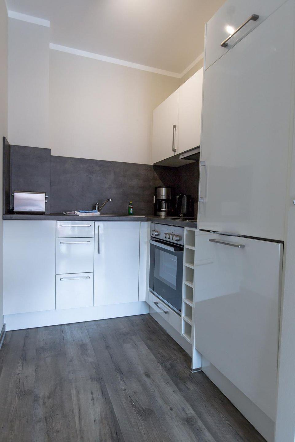 Offene Küchenzeile im Wohnraum mit Ceranfeld, Backofen, Geschirrspüler, Kühlschrank mit Gefrierfach