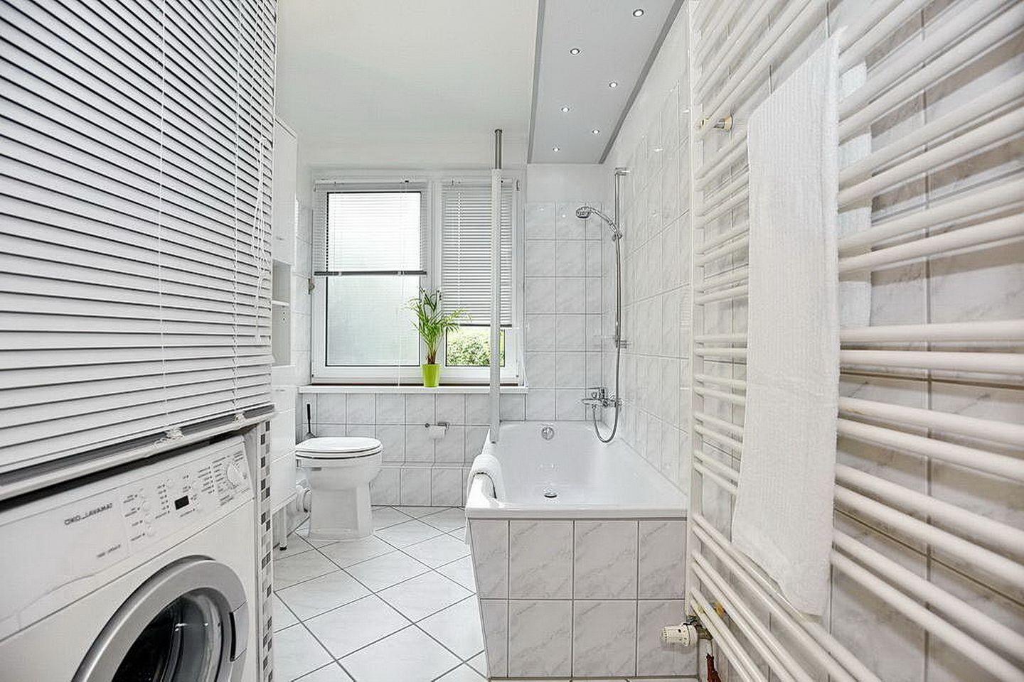 Das Tageslichtbad ist mit einer Badewanne mit Wannengriff, einem WC und einer Waschmaschine ausgestattet. Ebenso findest du einen Spiegel, ein Regal und einen Handtuchheizkörper vor. An den Fenstern sind Rollos als Sichtschutz angebracht. Das Bad und der Küchenbereich sind gefliest. Im Wohn- und Essbereich, im Flur sowie im Schlafzimmer ist Laminat verlegt.