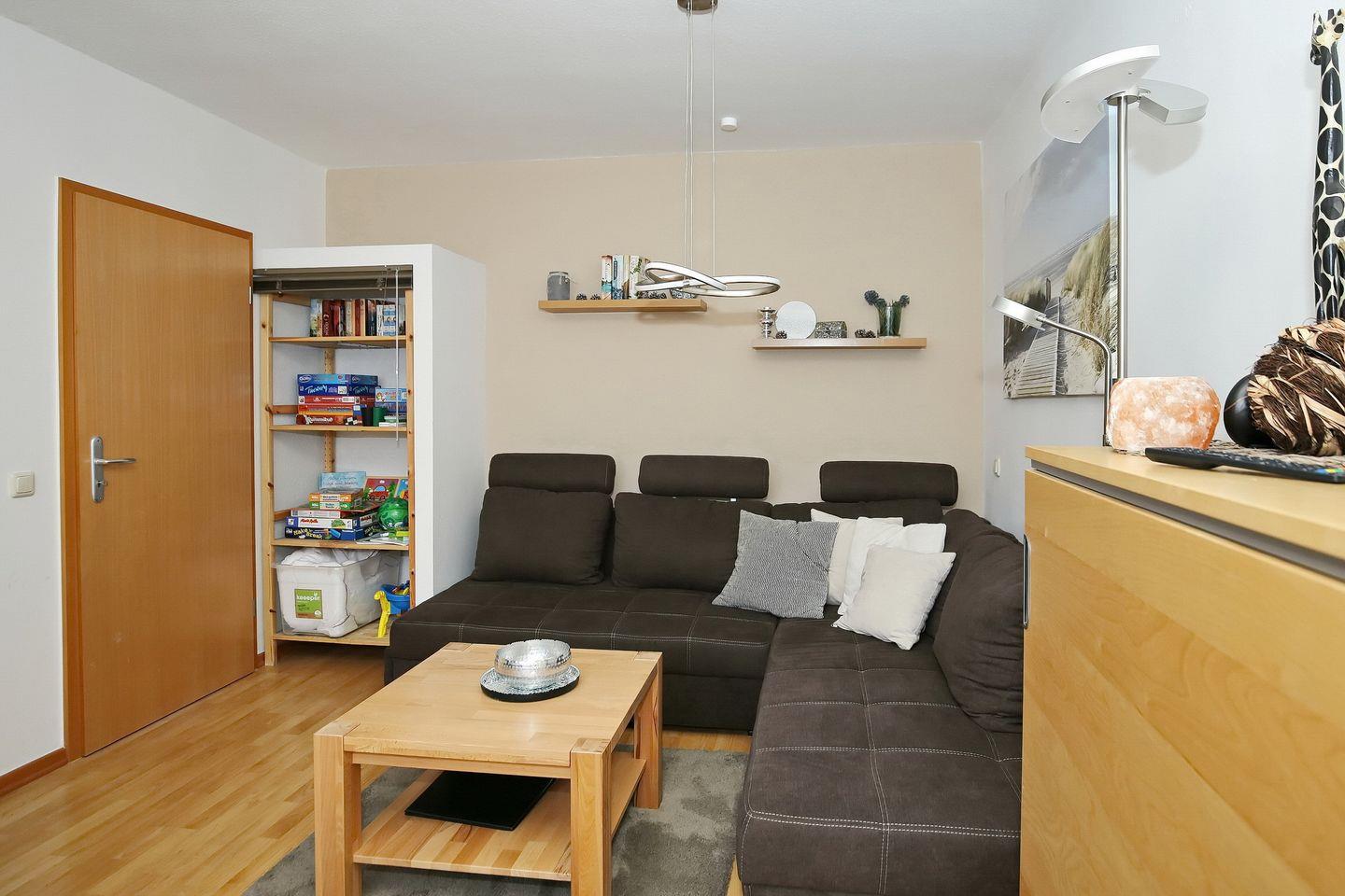 Der Wohnbereich der Ferienwohnung ist mit einer Schlafcouch, einem Schrank sowie einem Flachbild-TV und einem CD-Radio eingerichtet. Der integrierte Essbereich bietet 3 Personen genügend Platz für gemeinsame Mahlzeiten. Ein Kinderhochstuhl (ab 3 Jahren) sowie ein Kinderreisebett (inklusive Bettdecke und Kopfkissen) stehen dir kostenfrei zur Verfügung.