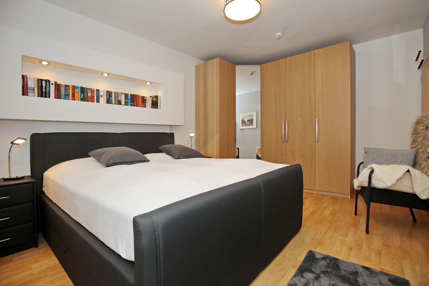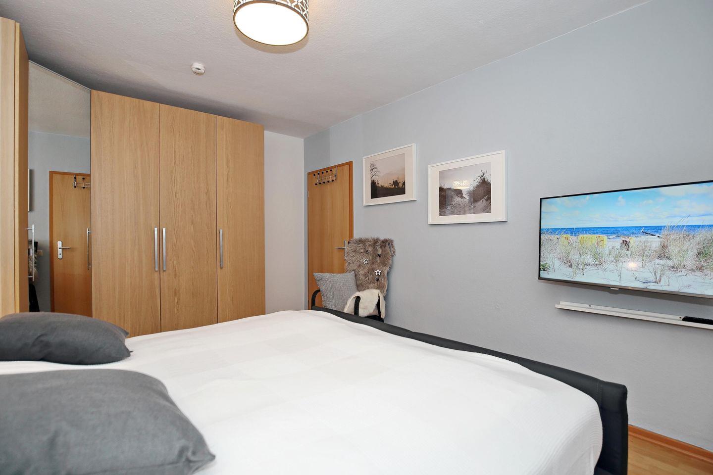 Im Schlafzimmer lädt dich ein komfortables Boxspringbett (180 x 200 cm) zur erholsamen Nachtruhe ein. Dein Urlaubsgepäck kannst du im großen Kleiderschrank verstauen. Ein Flachbild-TV sorgt auch hier für Unterhaltung. Ebenfalls sind eine kleine Bibliothek und ein Wecker vorhanden. Vom Schlafzimmer aus hast du Zugang zur Terrasse. Vorhänge und Plissees dienen dir hier als Sichtschutz oder zum Verdunkeln. Die Schlafcouch (135 x 250 cm) im Wohnbereich wird schnell zu einem Schlafplatz. Hier kannst du Vorhänge zum Verdunkeln nutzen.