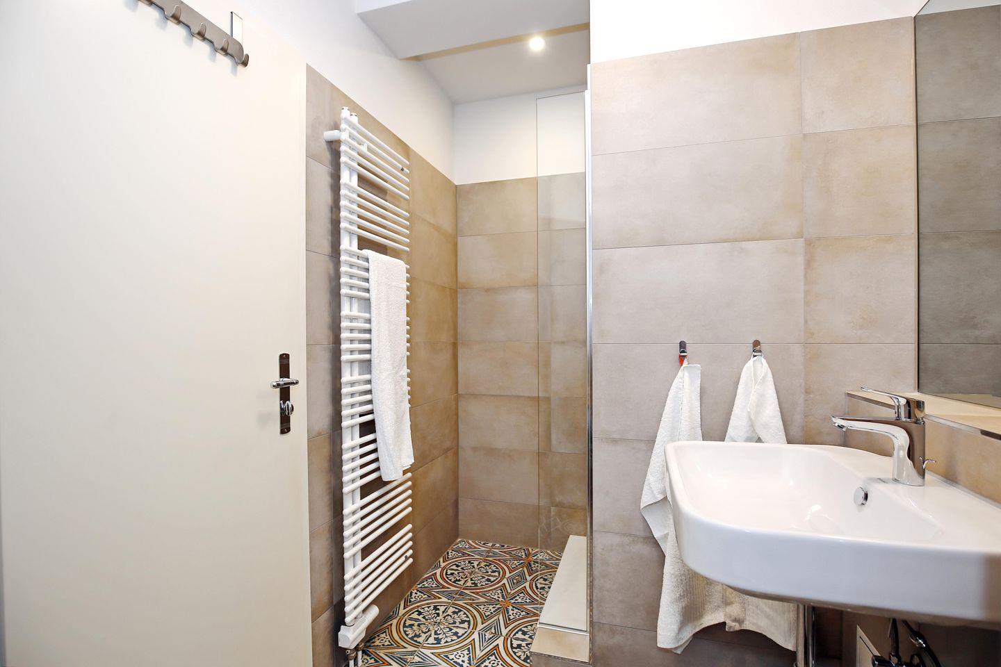 Die Ferienwohnung verfügt selbstverständlich auch über ein hochwertiges Badezimmer mit einer Dusche mit niedrigem Einstieg, einem WC, einem Waschbecken, einem Wand-Fön, einem Spiegel und einem Handtuch-Heizkörper für die Handtücher. Die komplette Wohnung wurde mit hochwertigem Vinyl ausgelegt.
