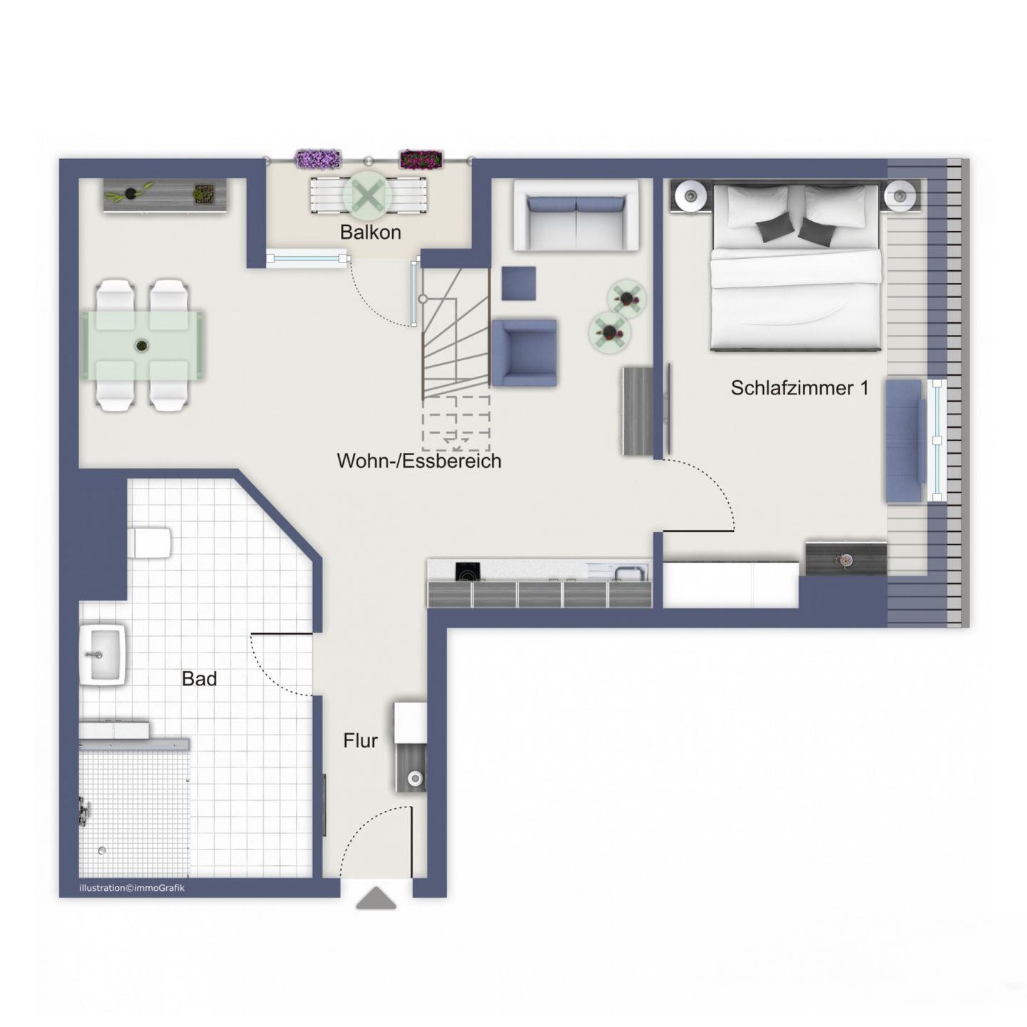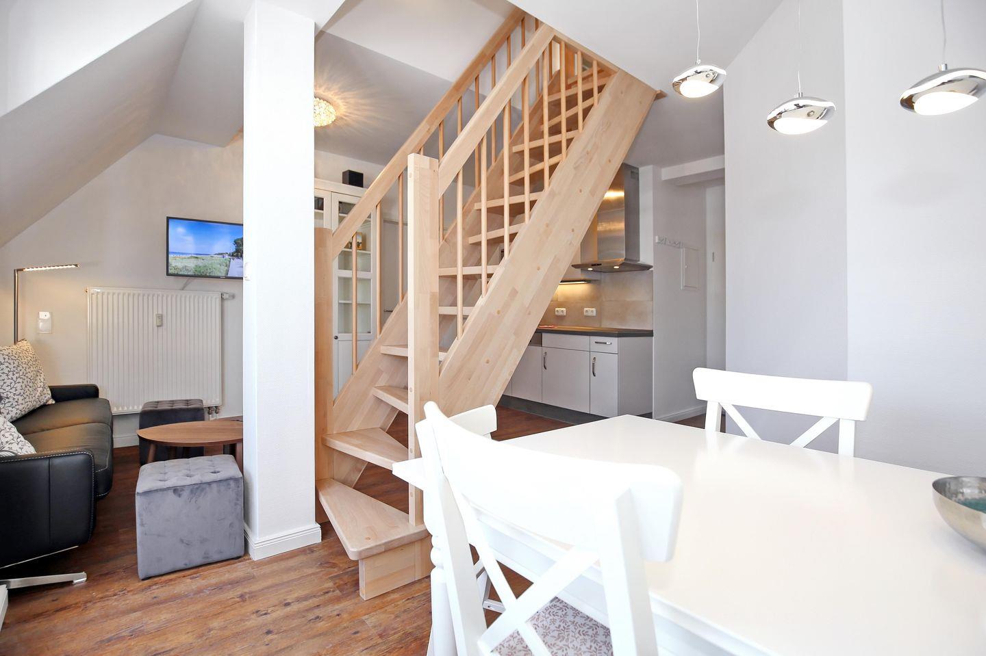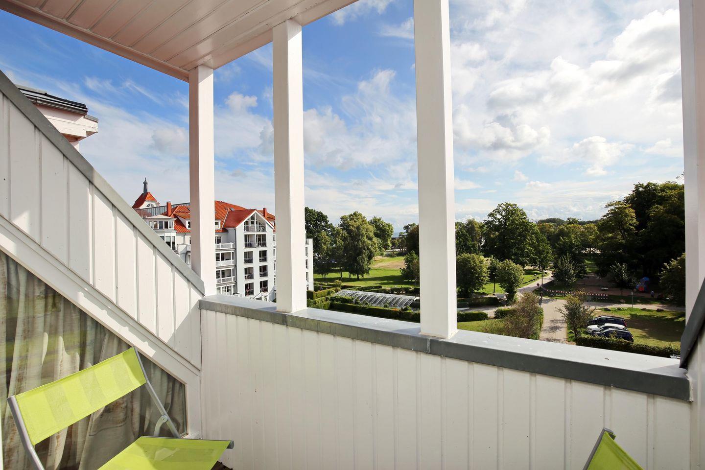 Deine Ferienwohnung mit einer möblierten Loggia, in Ost-Ausrichtung, liegt im 3. OG. Von der Loggia hast du einen Teilseeblick und einen Blick in den gegenüberliegenden Park. Auf einer Fläche von ca. 50m² bietet die Wohnung ein separates Schlafzimmer, einen Wohn- und Essbereich mit einer zusätzlichen bequemen Schlafcouch, eine Küchenzeile, ein modernes Duschbad sowie im Spitzboden weitere Schränke für Kleidung, Stauraum für Koffer und eine Leseecke. Die Strandentfernung beträgt 50 m.