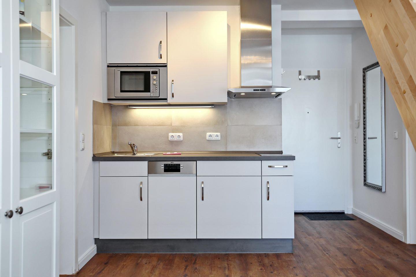 Die Küchenzeile ist ausgestattet mit einem 2-Platten-Cerankochfeld, einem Kühlschrank mit Gefrierfach, einer Mikrowelle, einem Geschirrspüler, einem Eierkocher, einem Toaster, einer Kaffeemaschine, eine Kaffeekapselmaschine (Nespresso Essenza Mini) und einem Wasserkocher.