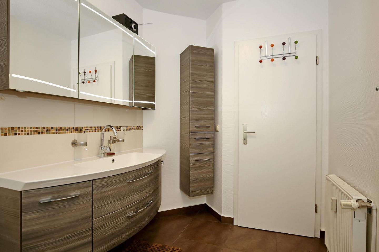 Selbstverständlich gibt es ein modernes Duschbad. Viele Ablagemöglichkeiten und ein Fön machen den Aufenthalt im Bad noch angenehmer. In der Ferienwohnung wurden Fliesen sowie ein PVC-Boden verlegt.