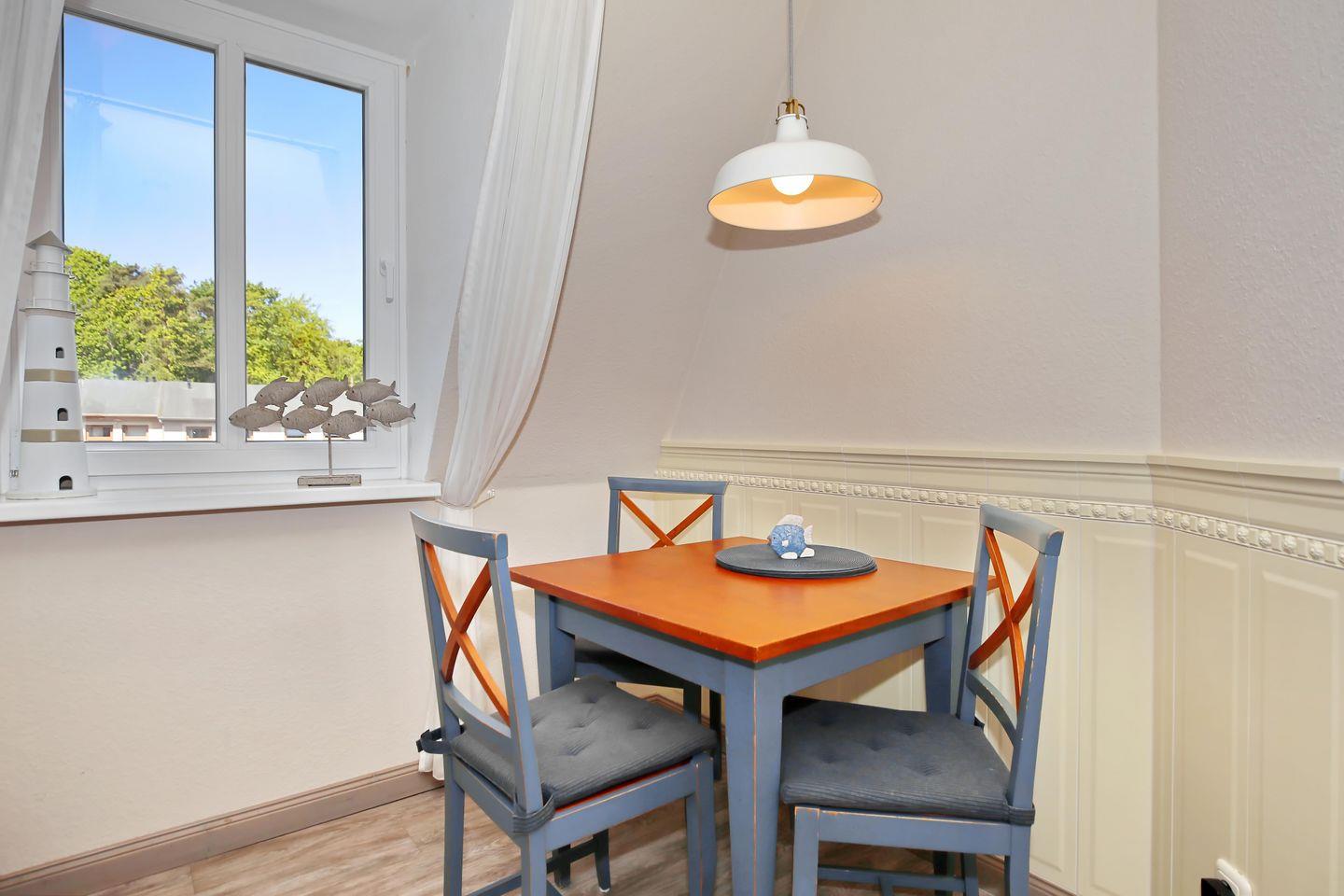 In der integrierten Küchenzeile stehen dir ein 2-Platten-Cerankochfeld, eine Mikrowelle, ein Kühlschrank mit Gefrierfach, eine Kaffeemaschine, ein Wasserkocher und ein Toaster zur Verfügung. Am Esstisch kannst du deine gemeinsamen Mahlzeiten in der Ferienwohnung genießen.