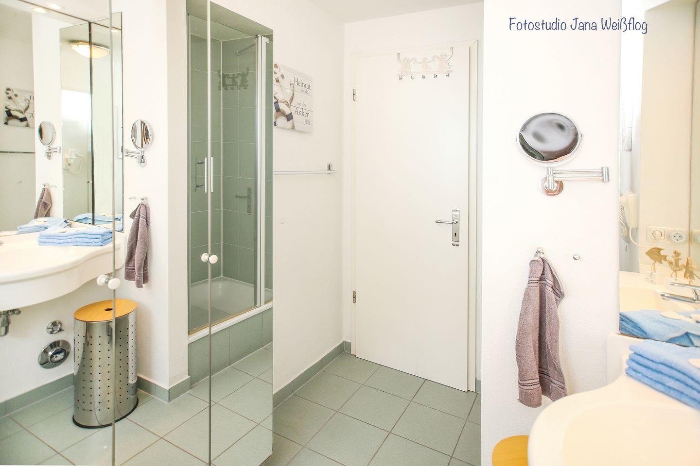 Das großzügige Duschbad mit Fenster ist mit WC, Waschtisch, Kosmetikspiegel und Fön gut ausgestattet. Im Wohnbereich wurde Vinyl verlegt. Ausnahme sind die Schlafzimmer der Ferienwohnung. Hier findest du einen Laminatboden.