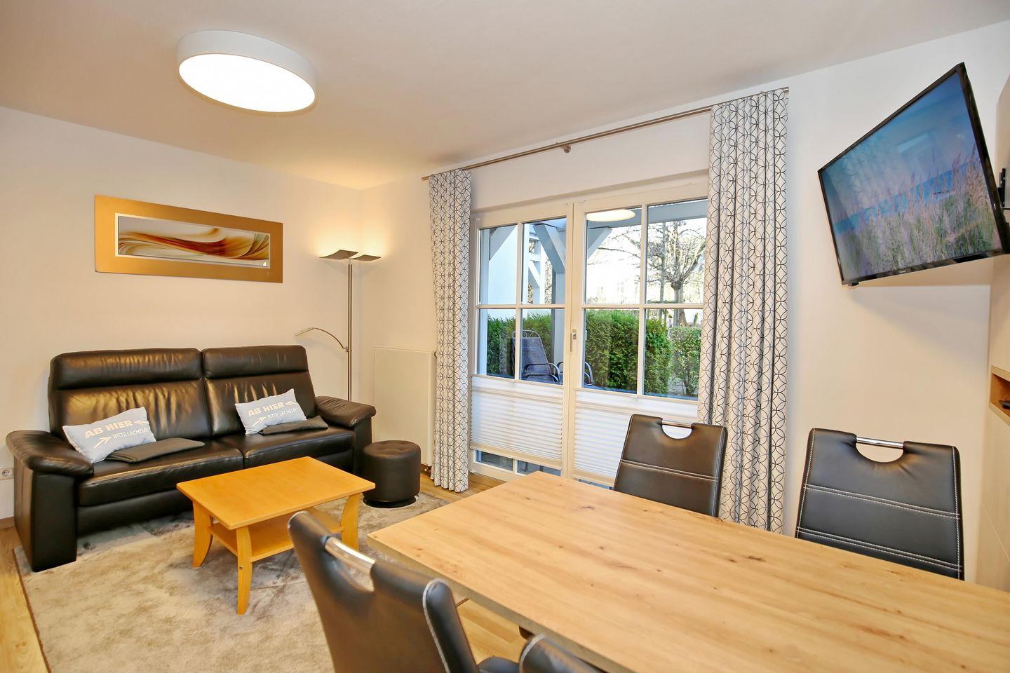 Der einladende Wohnbereich empfängt dich mit einer modernen Ledersitzgruppe. Für gemütliche Abende steht dir ein Flachbild-Fernseher und eine Sammlung an Büchern bereit. Des Weiteren steht dir kostenfreies WLAN zur Verfügung. Durch die doppelflügelige Tür gelangst du von hier aus auf die geschützte Terrasse der Ferienwohnung.