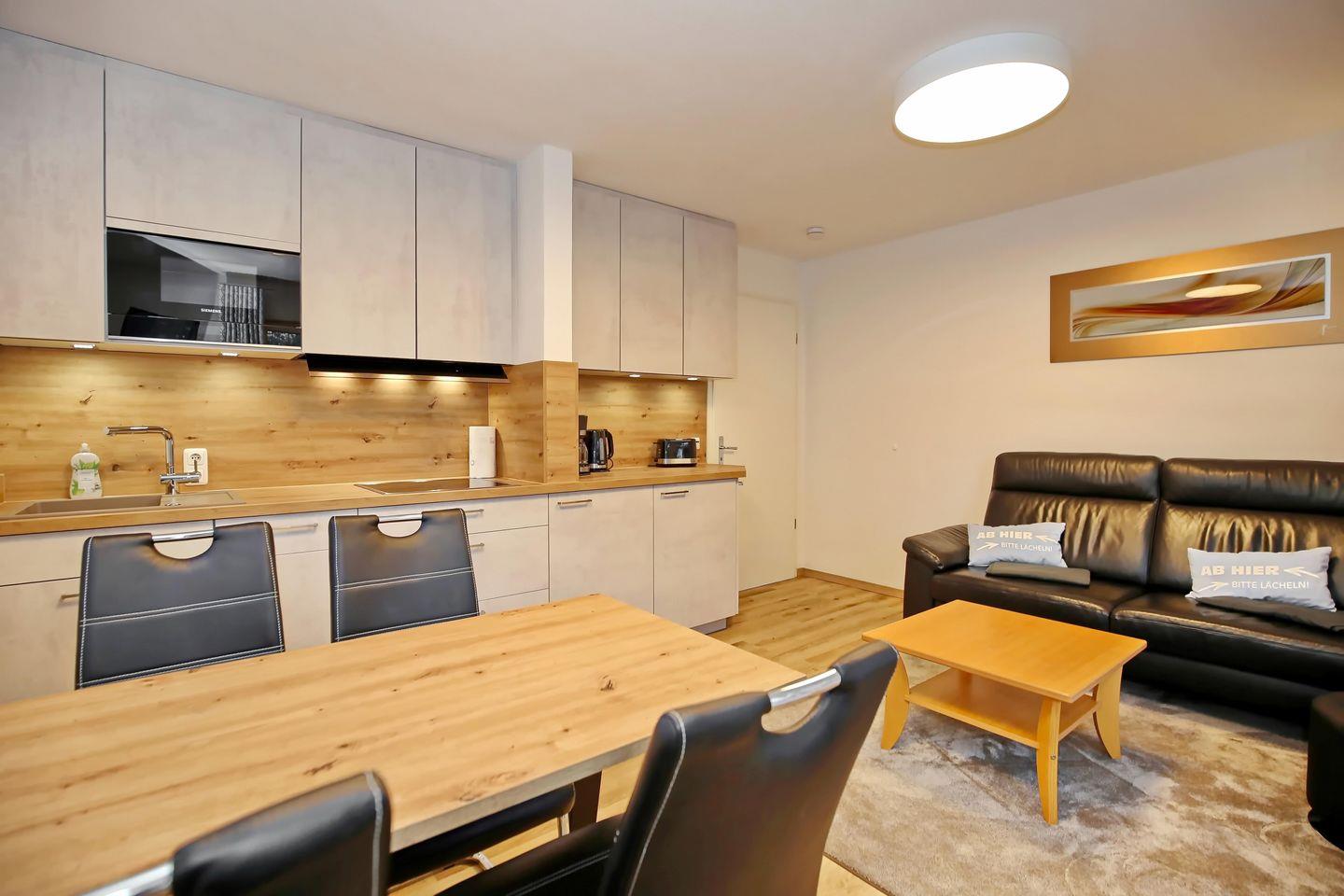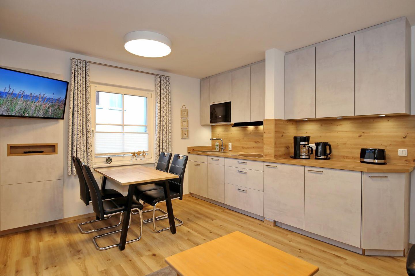 Die im Frühjahr 2024 erneuerte Küche ist mit 4-Zonen-Induktionsfeld, Geschirrspüler, Mikrowelle und Kühlschrank mit Tiefkühlfach modern in den Wohnbereich integriert. Eine Kaffeemaschine, ein Wasserkocher und ein Toaster sind selbstverständlich auch vorhanden. Am gegenüberliegenden Esstisch haben 4 Personen Platz.
