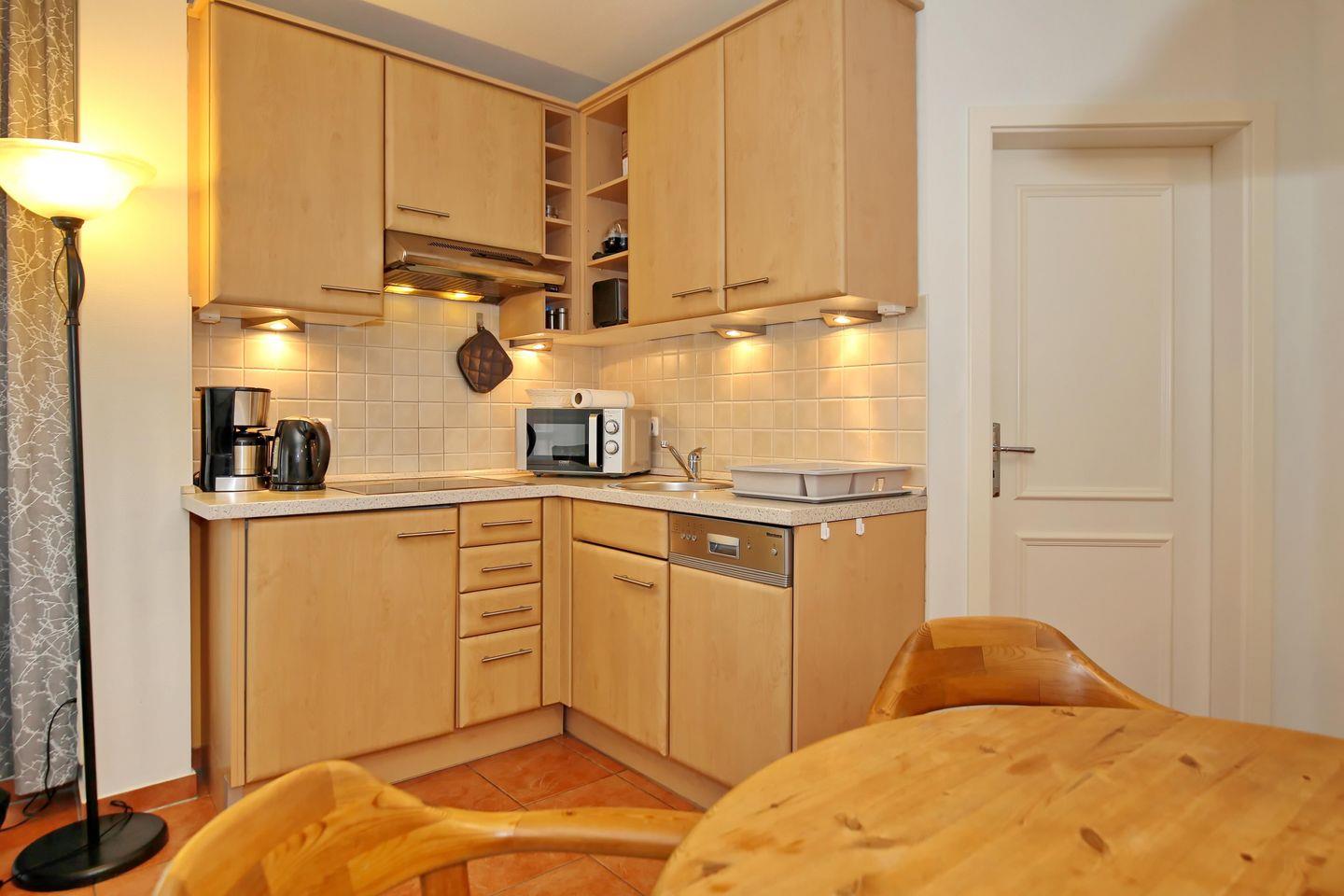 Die angrenzende Küchenzeile ist für dich mit einem 4-Platten-Cerankochfeld, einem Kühlschrank mit Gefrierfach, einem Geschirrspüler und einer Mikrowelle ausgestattet. Nützliche Kleingeräte wie eine Kaffeemaschine, ein Toaster und ein Wasserkocher komplettieren die Kücheneinrichtung.