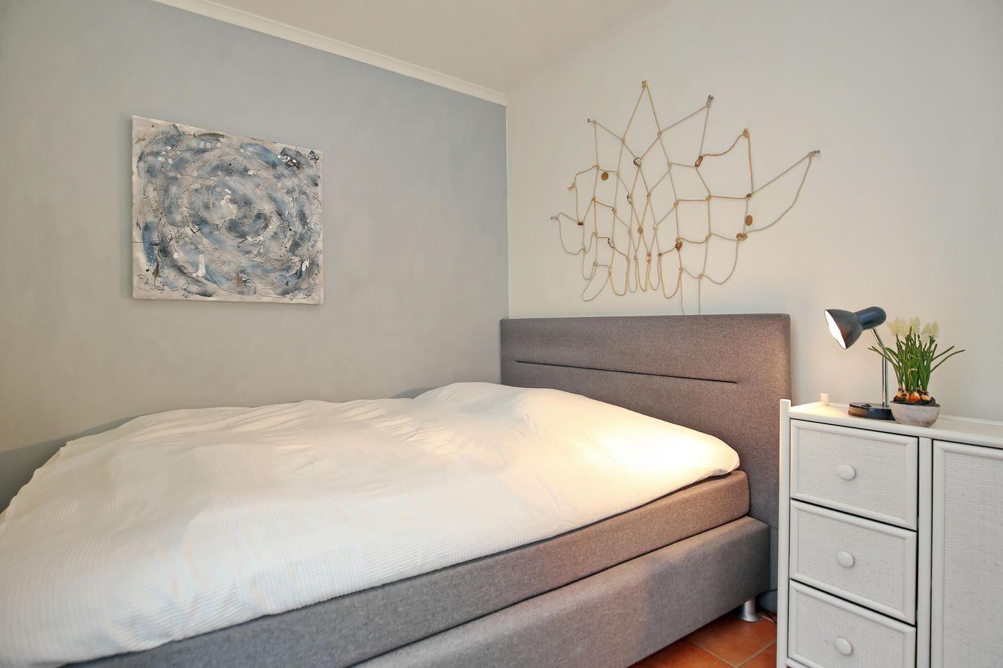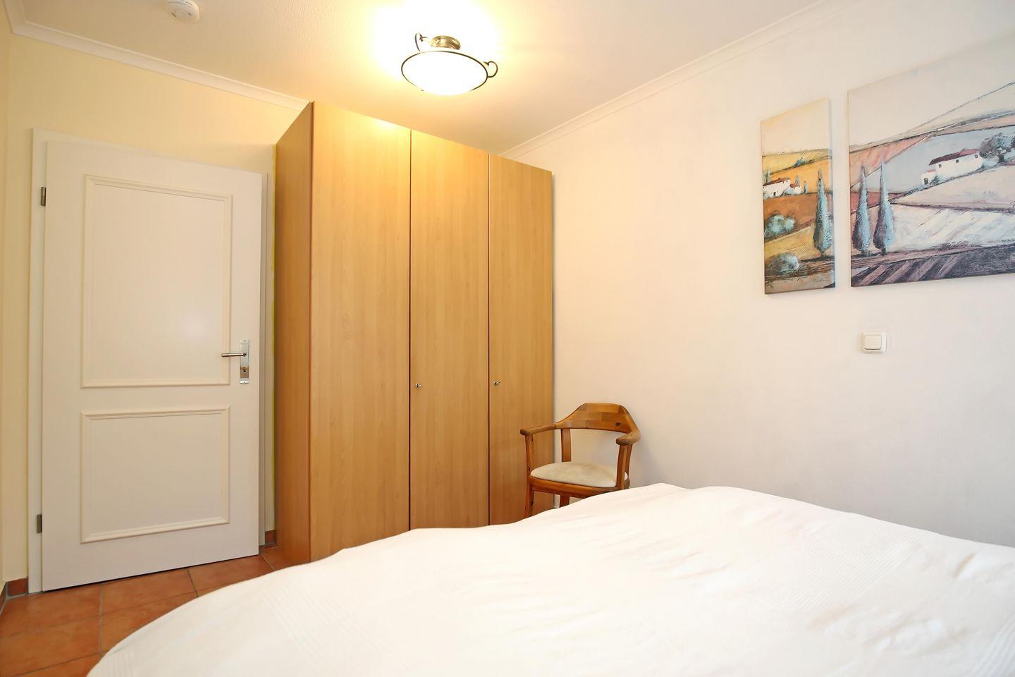 Im Schlafzimmer der Ferienwohnung erwartet dich ein Doppelbett (2x 90 x 200 cm) zur erholsamen Nachtruhe. Ein großer Kleiderschrank bietet dir Stauraum für deine Urlaubsgarderobe. Das zweite Schlafzimmer empfängt dich mit einem Boxspringbett (160 x 200 cm) und einem kleinen Kleiderschrank. Zur Verdunklung stehen dir in beiden Schlafräumen Verdunklungsvorhänge zur Verfügung.