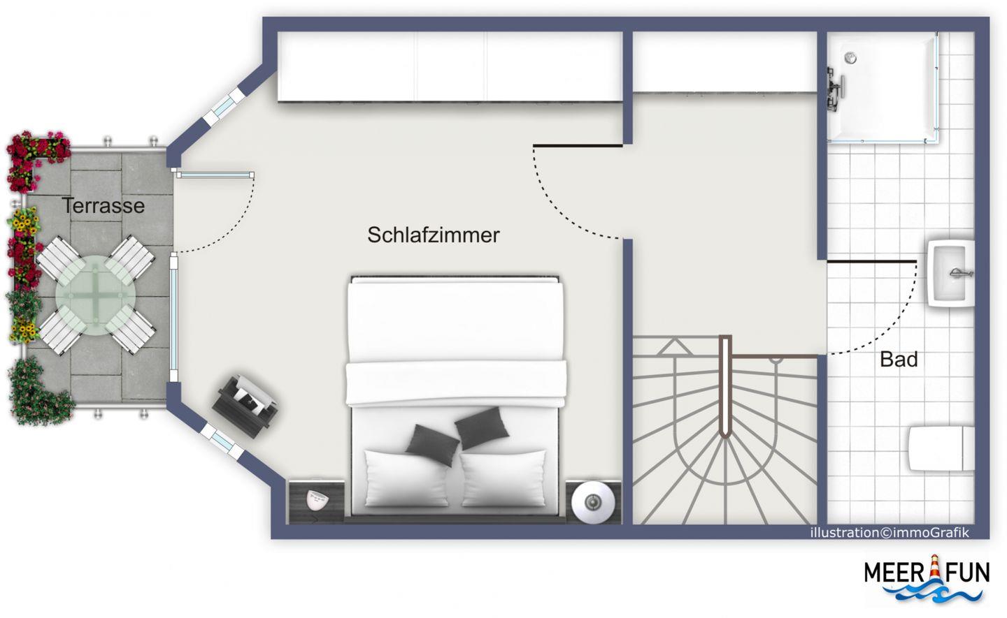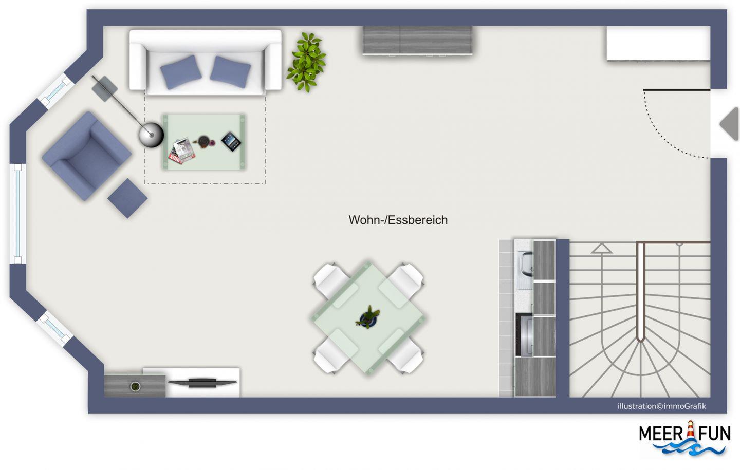 Deine Wohnung Nr. 3 im Haus La Mer ist eine 2-Zimmer-Wohnung mit einer Größe von etwa 55 m². Sie verläuft über 2 Etagen. Die Entfernung zum Strand beträgt etwa 50 m.