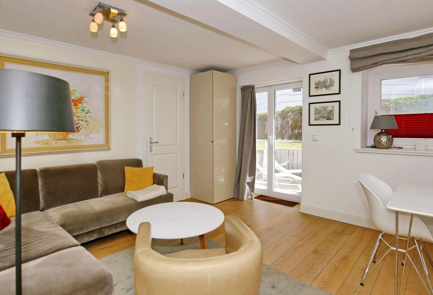 Der Wohn- und Schlafraum ist mit einem edlen Eichen-Parkettboden ausgestattet. In der gesamten Ferienwohnung sorgt eine Fußbodenheizung für wohlige Wärme. Vor der Couch sorgt ein Teppich zusätzlich für Gemütlichkeit.