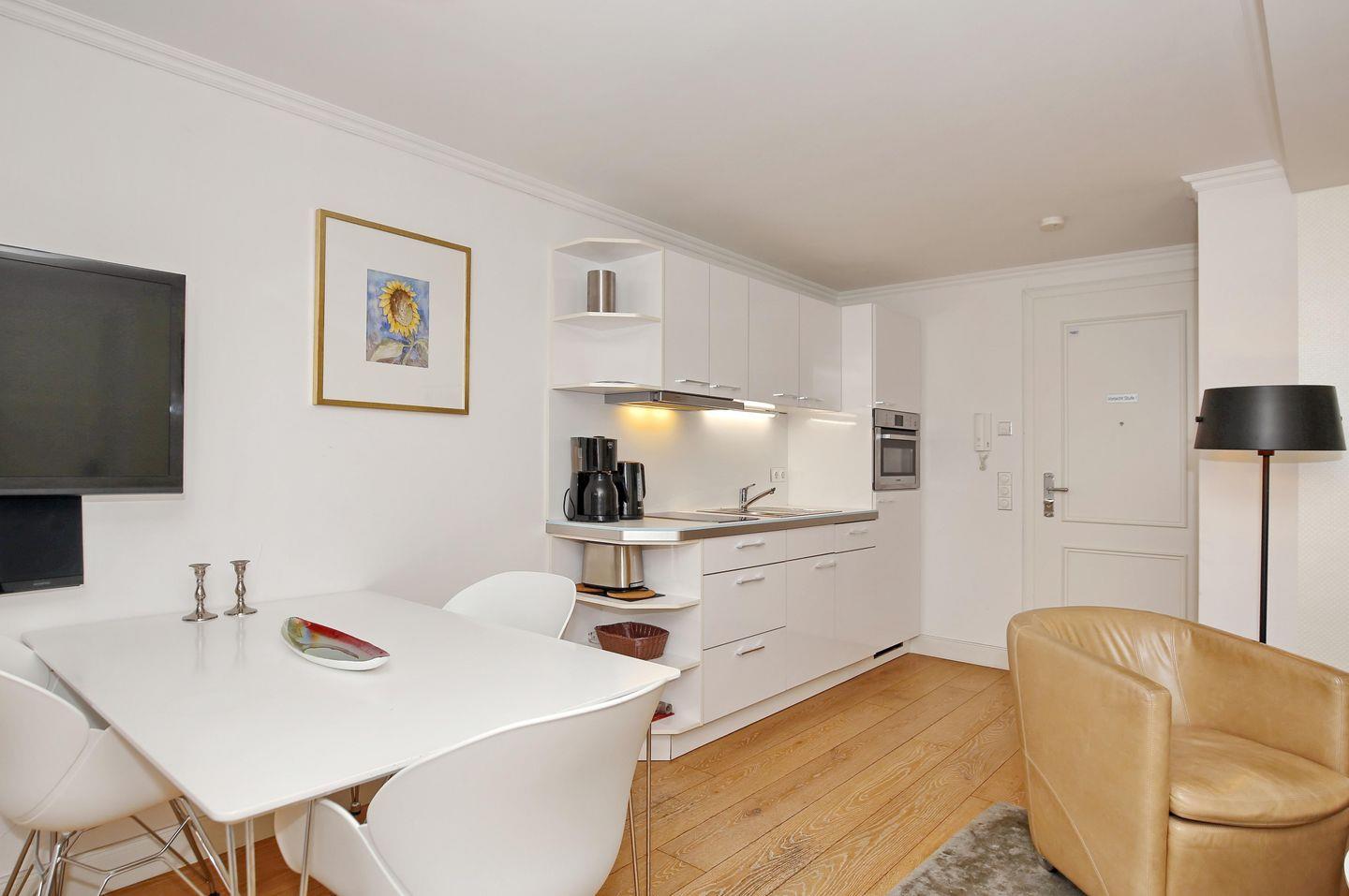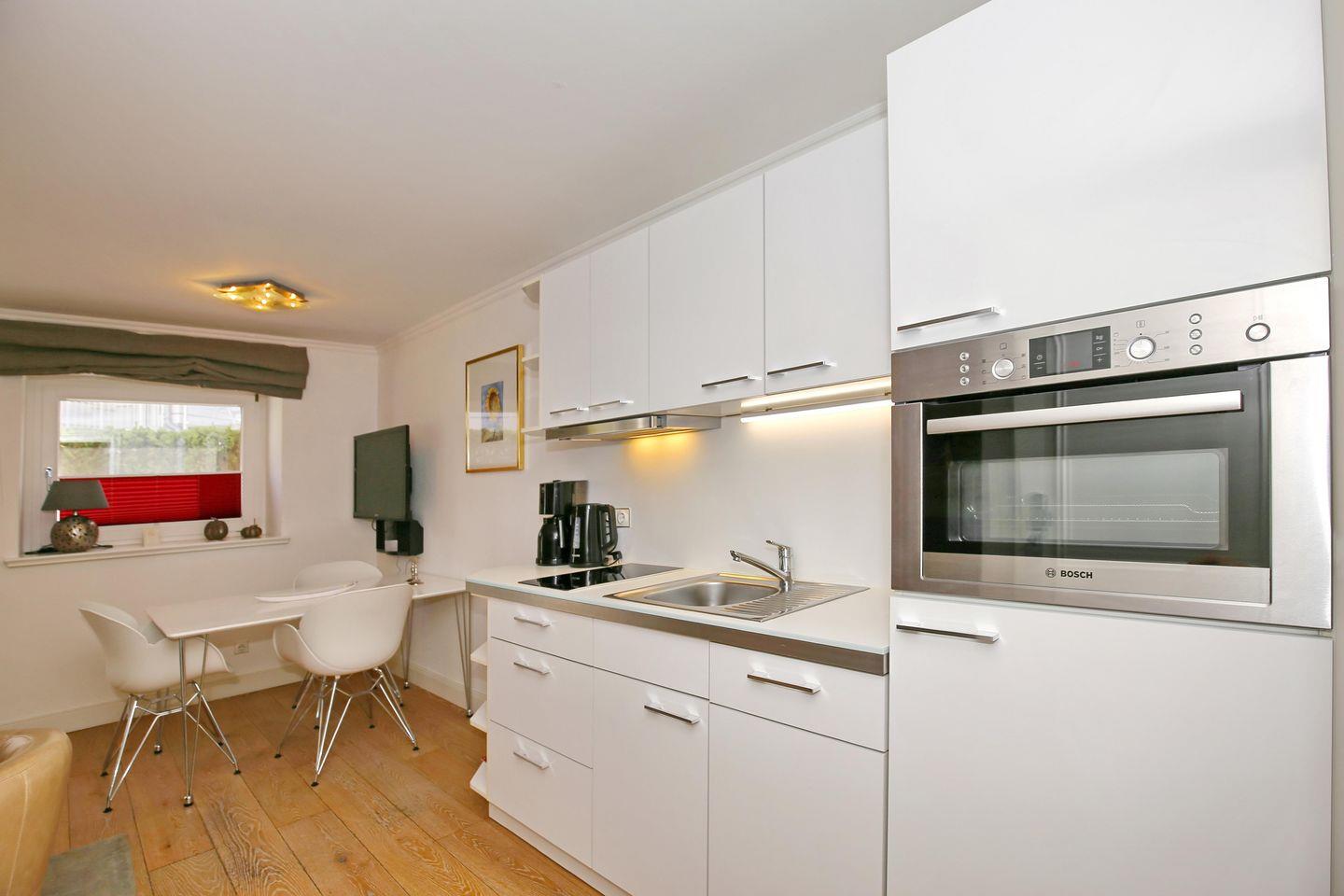 Die moderne Küchenzeile ist für dich mit einem 2-Zonen-Cerankochfeld, einer Backofen-/Mikrowellenkombi, einem Geschirrspüler sowie einem Kühlschrank mit Gefrierfach voll ausgestattet. Technische Kleingeräte, wie ein Wasserkocher, ein Toaster sowie eine Kaffeemaschine komplettieren die offene Küche.