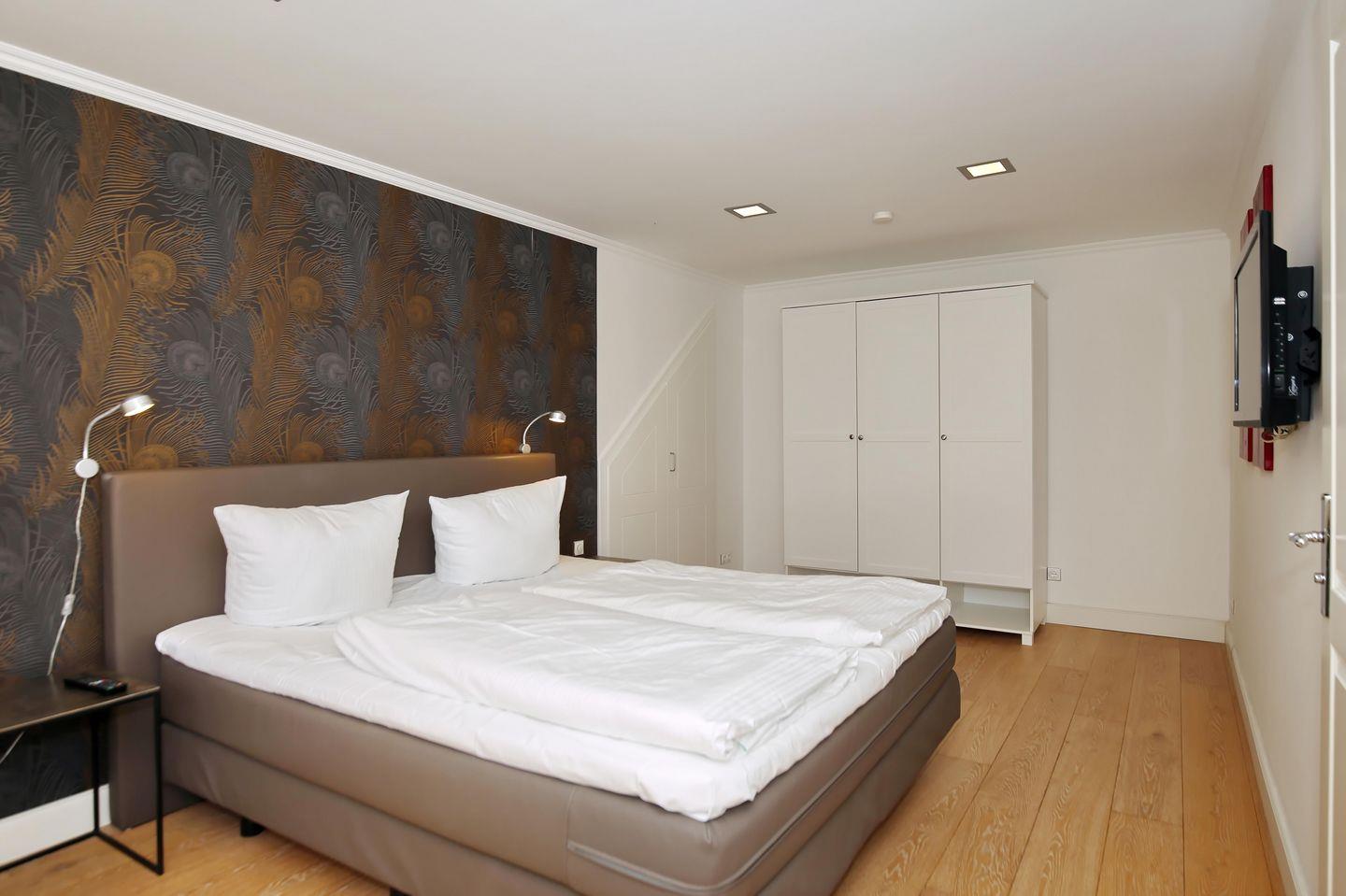 Im Schlafzimmer der Ferienwohnung empfängt dich ein bequemes Boxspringbett (180 x 200 cm) zur erholsamen Nachtruhe. Ein 3-türiger-Kleiderschrank bietet dir genügend Stauraum für dein Urlaubsgepäck. Ein Flachbild-TV sorgt für spätabendliche Unterhaltung. Vorhänge dienen dir an allen Fenstern als Sichtschutz.