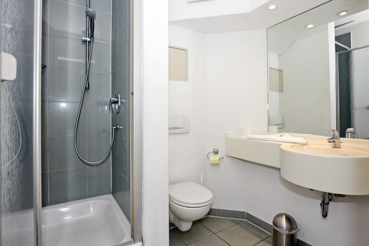 Das Bad der Ferienwohnung ist innenliegend. Hier stehen dir eine Dusche, ein WC, ein Waschbecken und ein großer Spiegel zur Verfügung. Die gesamte Wohnung ist mit Laminat ausgelegt. Nur in den Nassbereichen gibt es einen Fliesenboden.