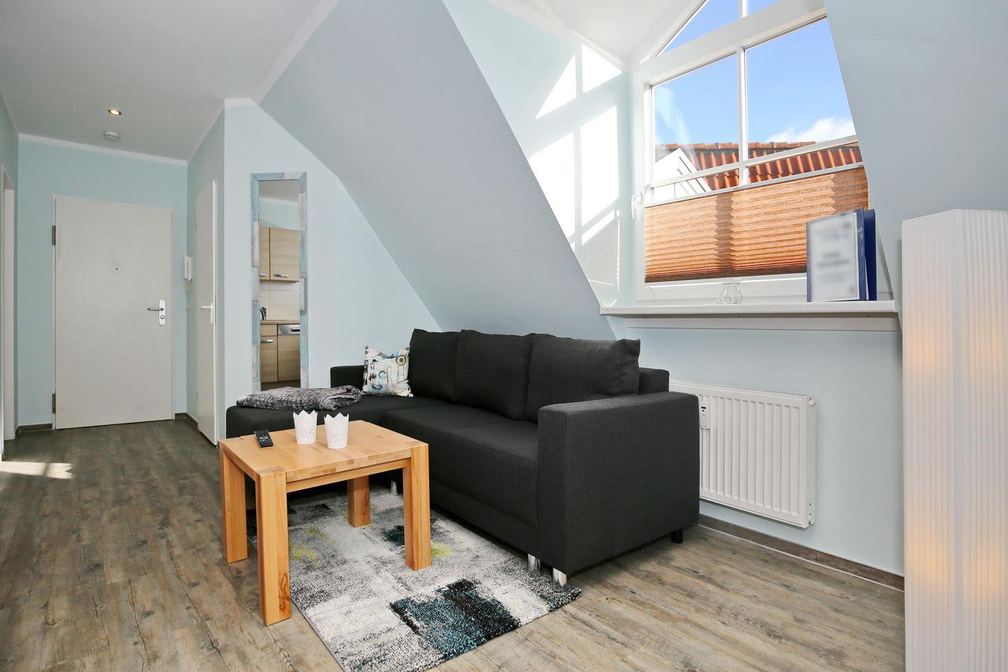 Auf den 35 m² der kleinen aber feinen Dachgeschoss-Wohnung erwarten dich ein Wohn- und Schlafbereich mit integrierter Küchenzeile und Esstisch, ein Duschbad und ein Abstellraum. Die Wohnung ist bequem mit einem Lift zu erreichen. Zum feinen Sandstrand und zur Seebrücke sind es etwa 300 Meter.