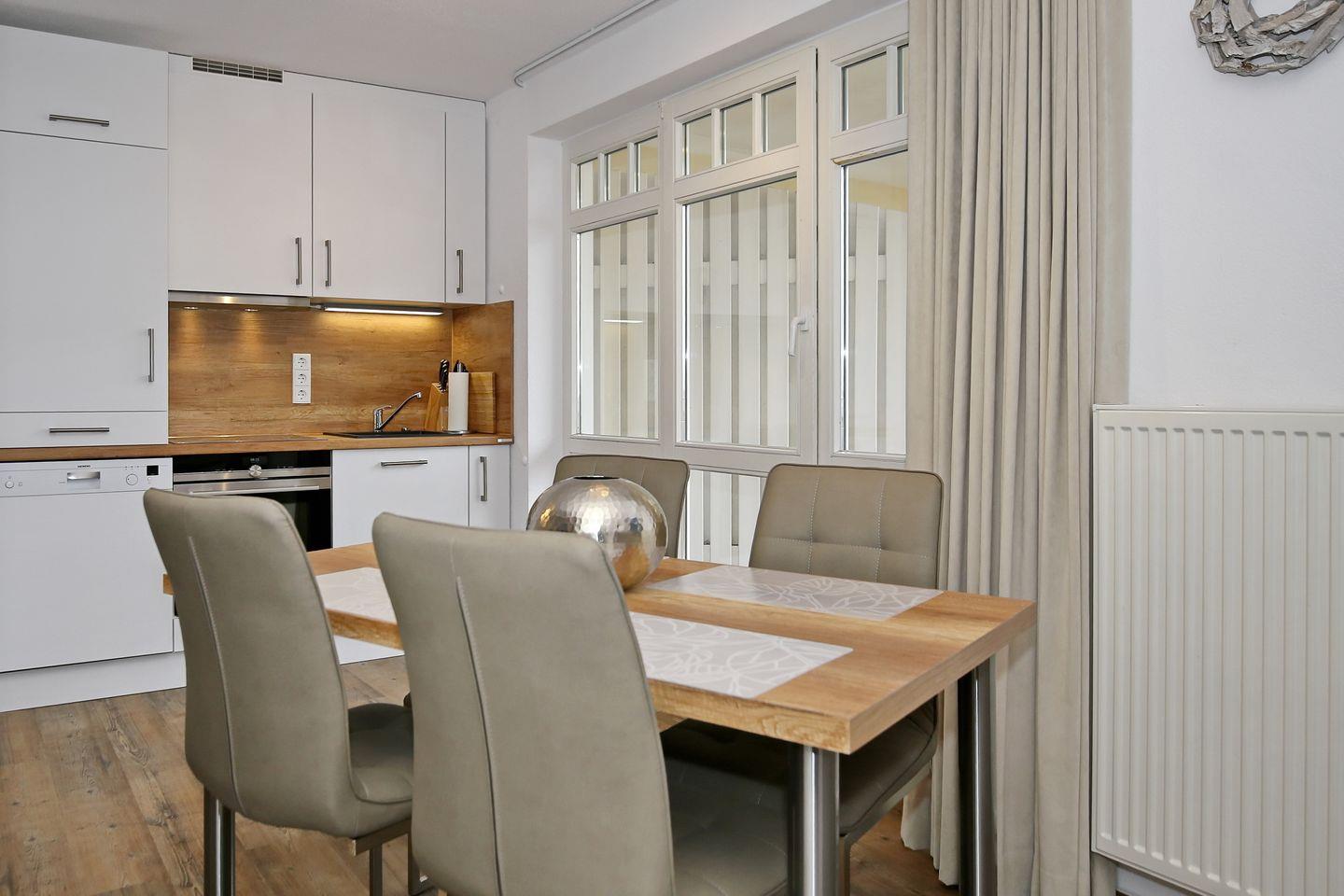 An den Wohnraum angrenzend findest du die funktional eingerichtete Küchenzeile. Diese verfügt über ein 4-Platten-Cerankochfeld, einen Geschirrspüler, einen Backofen mit integrierter Mikrowelle, einen Kühlschrank mit Gefrierfach sowie einen Wasserkocher, einen Toaster und eine Kaffeemaschine.