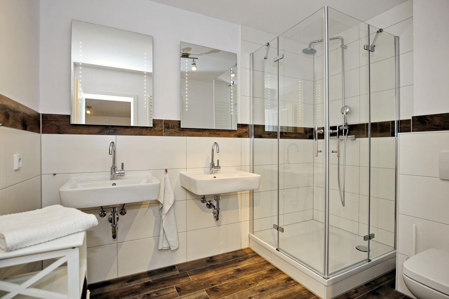 Die Ferienwohnung verfügt über ein großzügiges gefliestes Duschbad mit WC und zwei Handwaschbecken. Für deine Waschutensilien gibt es genug Ablagefläche. In der gesamten Wohnung wurde ein Vinyl-Boden verlegt. In dieser Nichtraucherwohnung sind Haustiere nicht erlaubt.