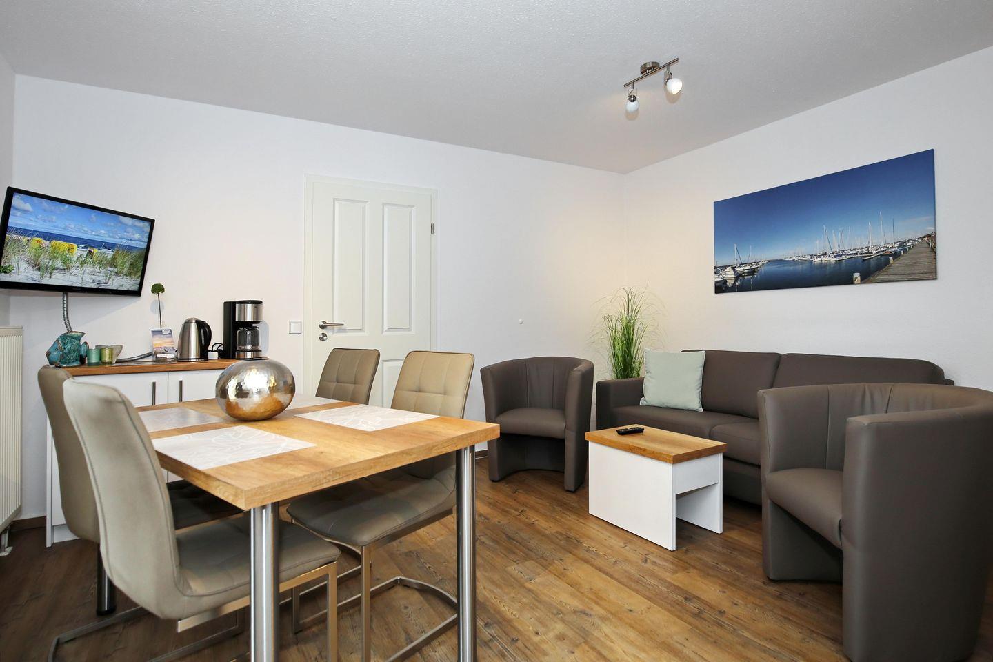 Deine moderne Ferienwohnung befindet sich im 1. Obergeschoss und bietet dir mit einer Größe von 47 m² genügend Platz. Die komfortable Wohnung verfügt über einen Wohn- und Essbereich mit angrenzender Küchenzeile, ein geräumiges Schlafzimmer und ein Duschbad. Hier kannst du ganz entspannt deinen Ostseeurlaub verbringen. Die Entfernung zum Strand beträgt etwa 100 Meter.