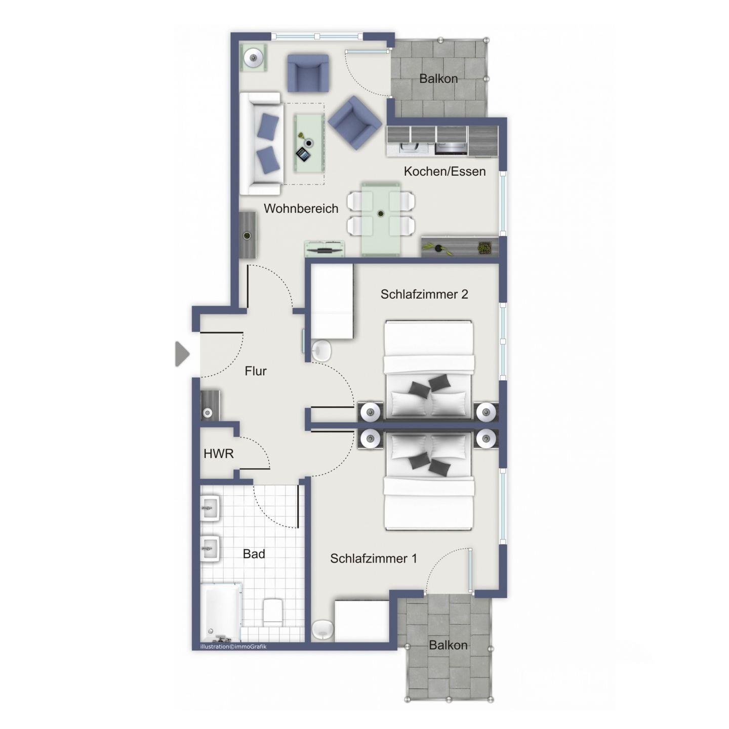 Deine Ferienwohnung befindet sich im 1. Obergeschoss, auf der Ostseite des Hauses und verfügt über zwei Balkone mit Teilseeblick. Mit einer Größe von 57 m² bietet die Wohnung mit einem geräumigen Wohn- und Essbereich, zwei komfortablen Schlafzimmern, einer funktionalen Küchenzeile und einem Duschbad viel Platz und lässt keine Wünsche offen. Die Entfernung zum Strand beträgt etwa 100 Meter.