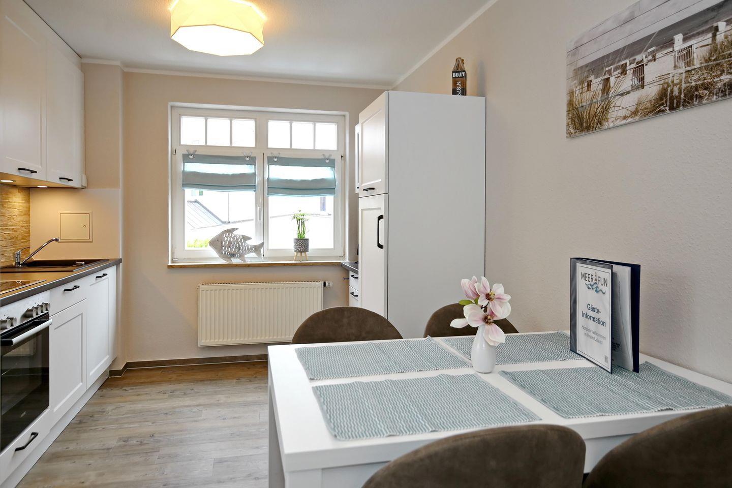 Die angrenzende offene Küchenzeile ist mit einem Kühlschrank mit Gefrierfach, einem Geschirrspüler, einem 4-Platten-Cerankochfeld, einer Mikrowelle und einem Backofen voll ausgestattet. Natürlich stehen dir ein Toaster, eine Kaffeemaschine und ein Wasserkocher zur Verfügung.