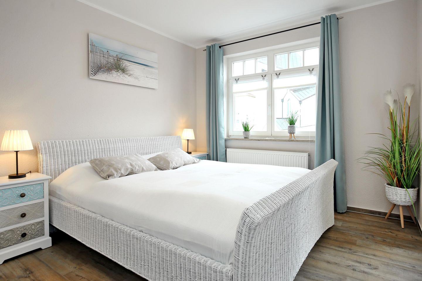 In den Schlafzimmern der Ferienwohnung lädt je ein gemütliches Doppelbett (2 x 90 cm x 200 cm) zum erholsamen Schlaf ein. In einem Schlafzimmer befindet sich ein Flachbild-TV. Ein Kleiderschrank und zwei Nachtschränke bieten dir viel Stauraum. Die Vorhänge an den Fenstern dienen dir zur Verdunklung.
