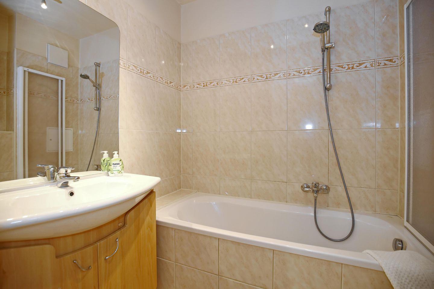 Das Badezimmer ist mit einer Badewanne und einem WC versehen. Die Wohnung ist gefliest und im Schlafzimmer wurde Teppich verlegt.