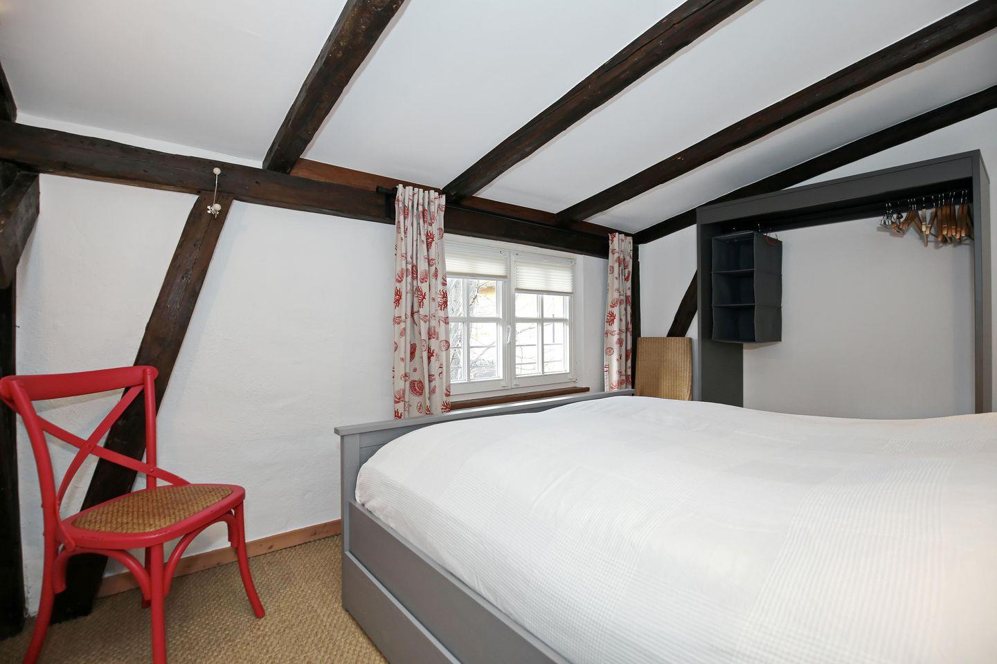 Das Schlafzimmer strahlt mit den Dachbalken Gemütlichkeit aus. Ein komfortables Doppelbett (2 x 80 x 200 cm) bietet dir erholsamen Schlaf. Ein Kleiderschrank sowie ein großes Regal dienen als Stauraum für deine Sachen. Die angebrachten Vorhänge kannst du als Sichtschutz bzw. zum Verdunkeln nutzen. Das Schlafsofa (80 x 200 cm) im Wohnbereich wird schnell zum Schlafplatz für eine weitere Person. Eine Scheibengardine ist als Sichtschutz angebracht.