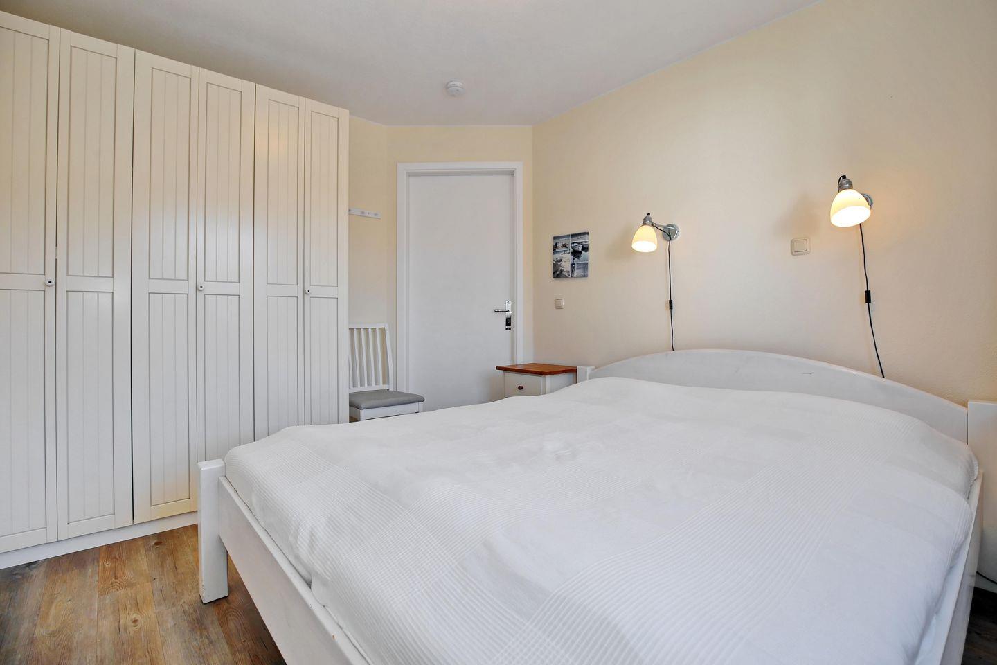 Im gemütlichen Schlafzimmer der Ferienwohnung findest du ein Doppelbett (2 x 90 cm x 200 cm Matratzen) und einen Kleiderschrank für deine Reiseutensilien vor. An den Fenstern sind Plissees zur Verdunklung angebracht. Der Design-Bodenbelag in Schiffsplankenoptik ist für Allergiker geeignet.