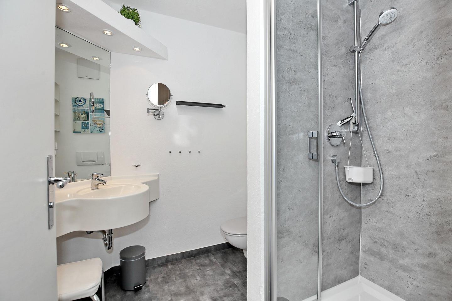 Das innenliegende Duschbad verfügt über ein WC, ein Waschbecken, einen Spiegel, einen Föhn und einen Kosmetikspiegel.