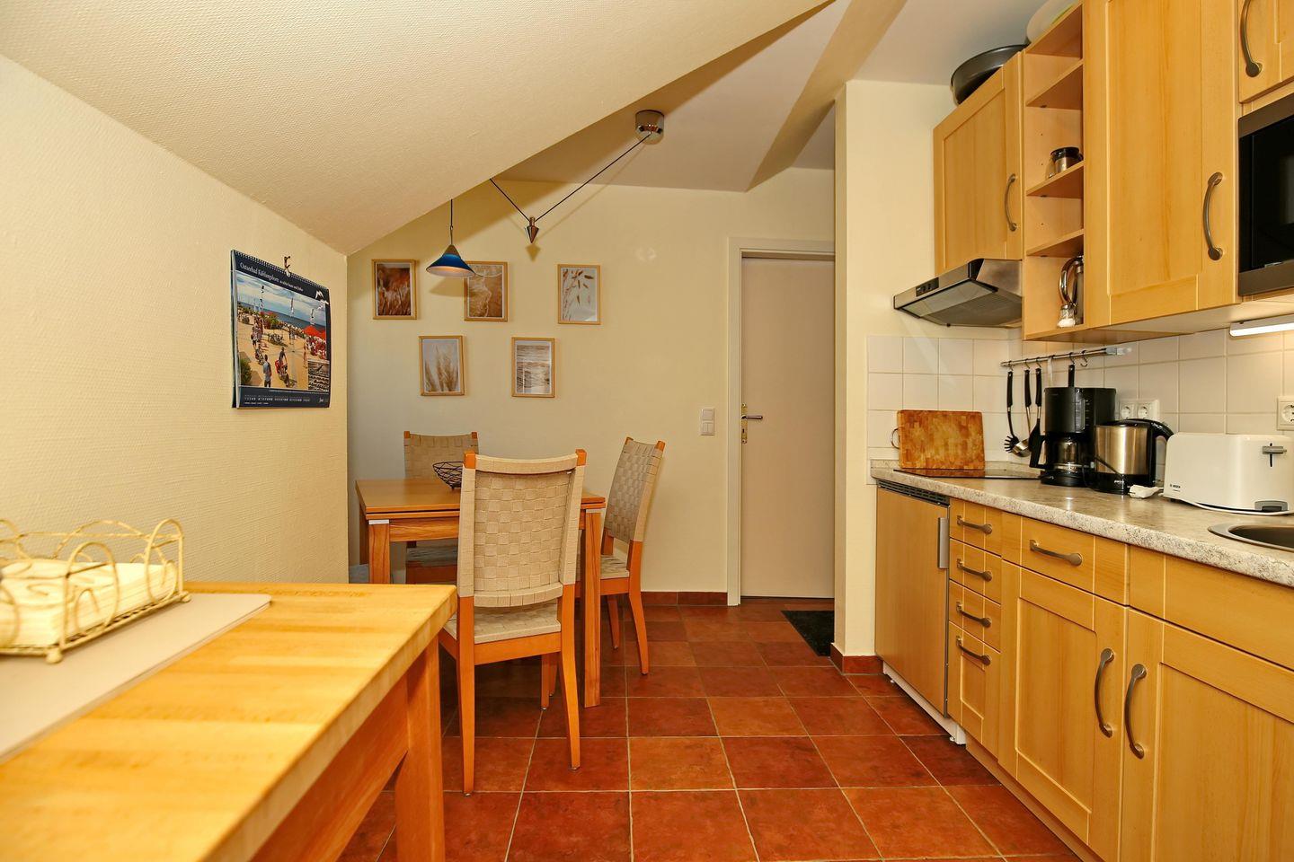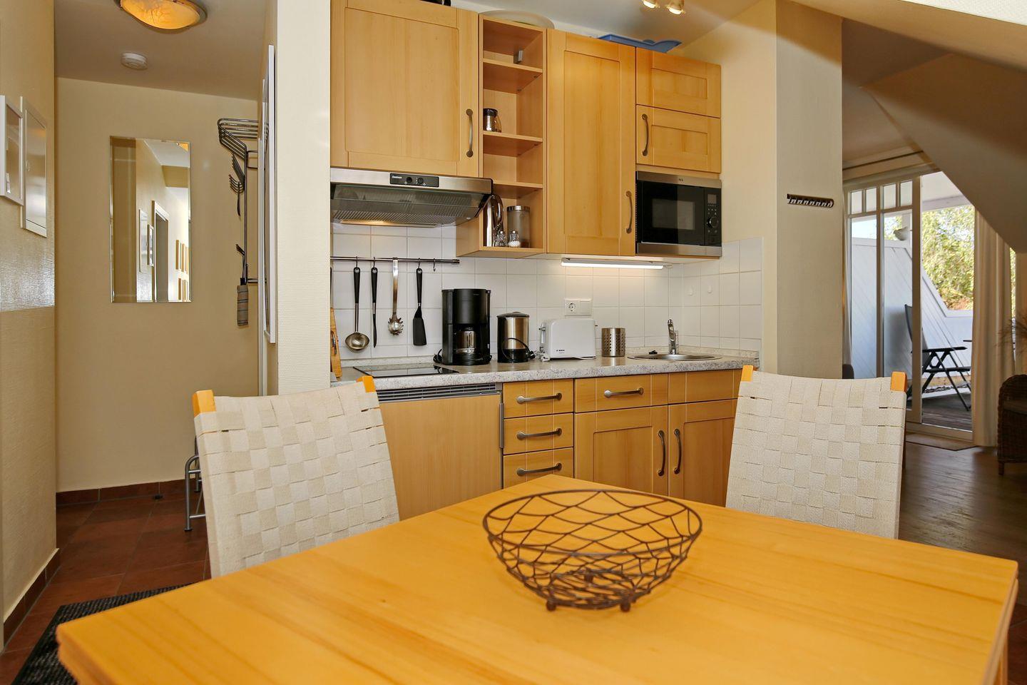 Die Küchenzeile der Ferienwohnung verfügt für dich über einen Wasserkocher, eine Kaffeemaschine, einen Geschirrspüler, einen Kühlschrank mit Gefrierfach, einen Toaster sowie eine Mikrowelle. Zum Kochen ist ein 2-Platten-Cerankochfeld sowie eine elektrische Bratpfanne vorhanden.