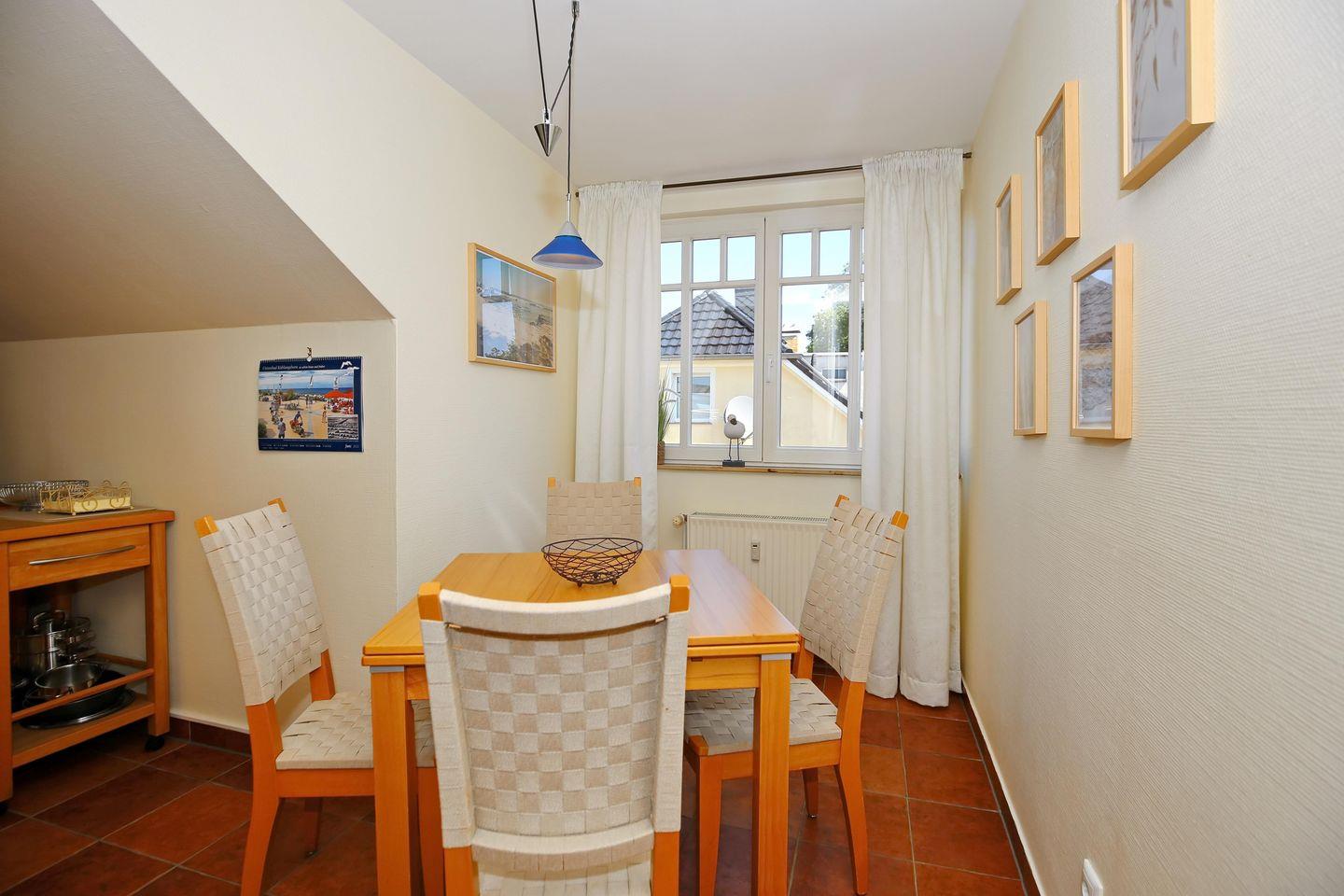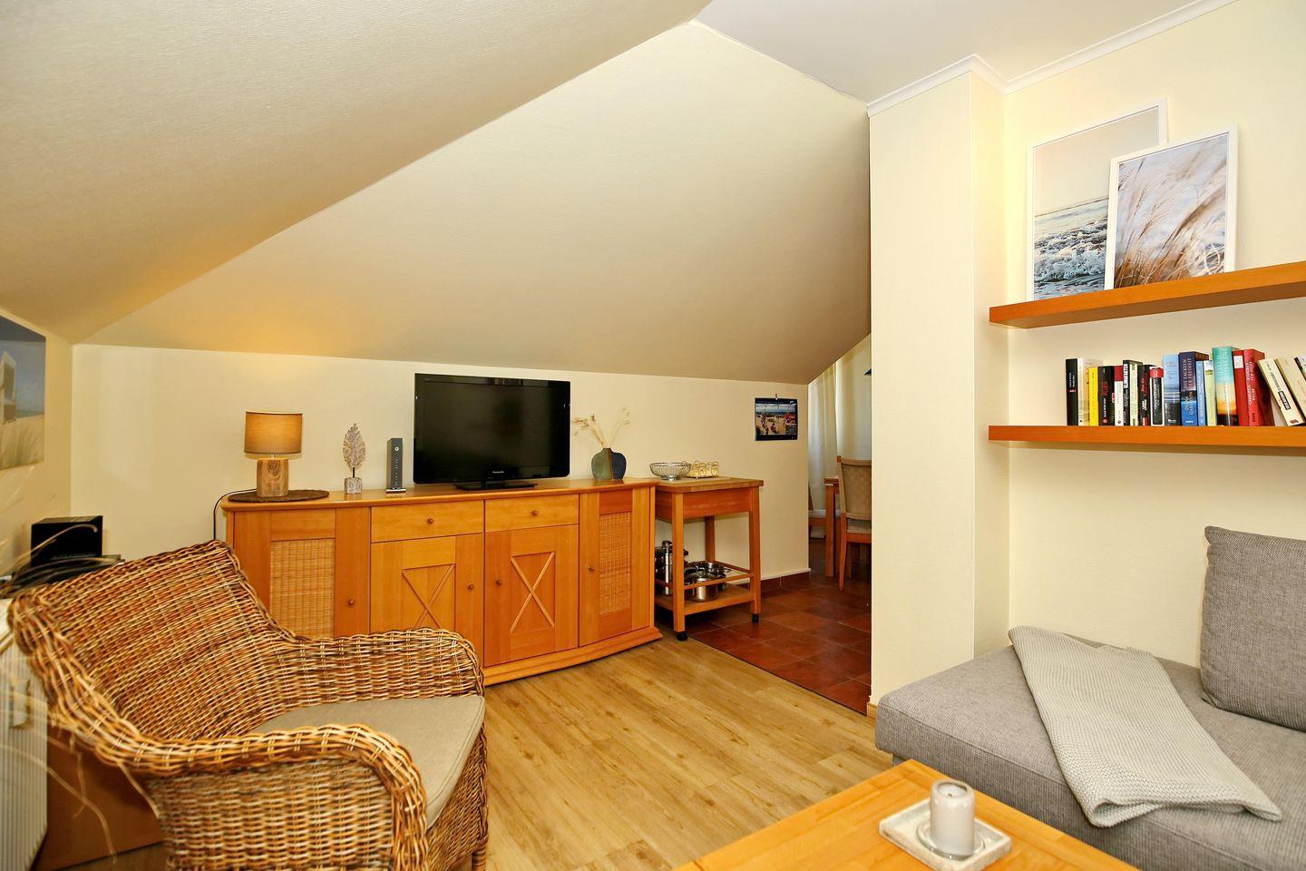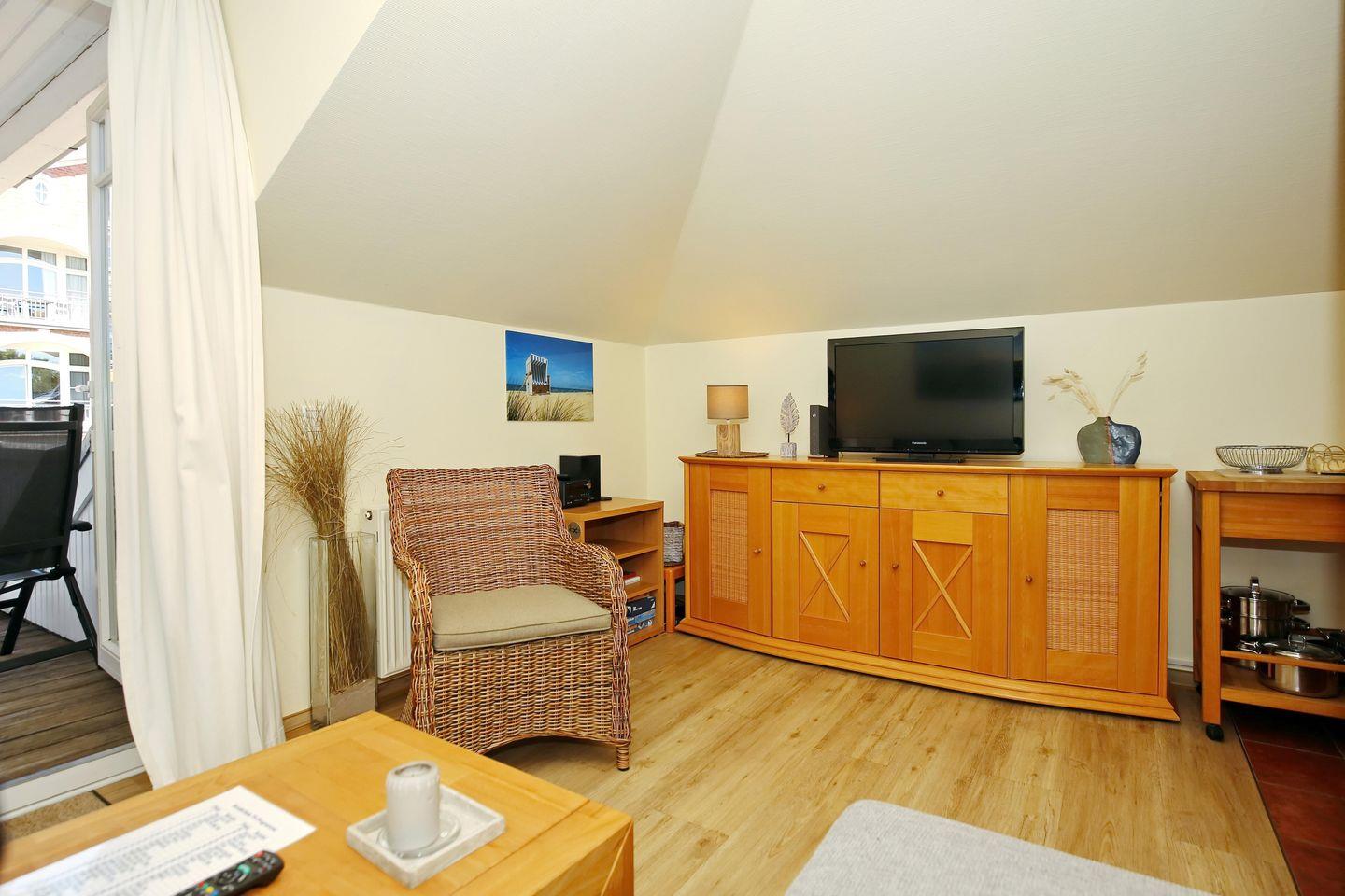 Der Wohnbereich ist für dich mit einer Couch, einem Korbsessel, einem Couchtisch, einer Stereoanlage, einer Kommode und einem Flachbild-TV gemütlich eingerichtet. Von hier aus gelangst du auf den Balkon der Ferienwohnung. Der Essbereich bietet dir ausreichend Platz für gemeinsame Mahlzeiten.