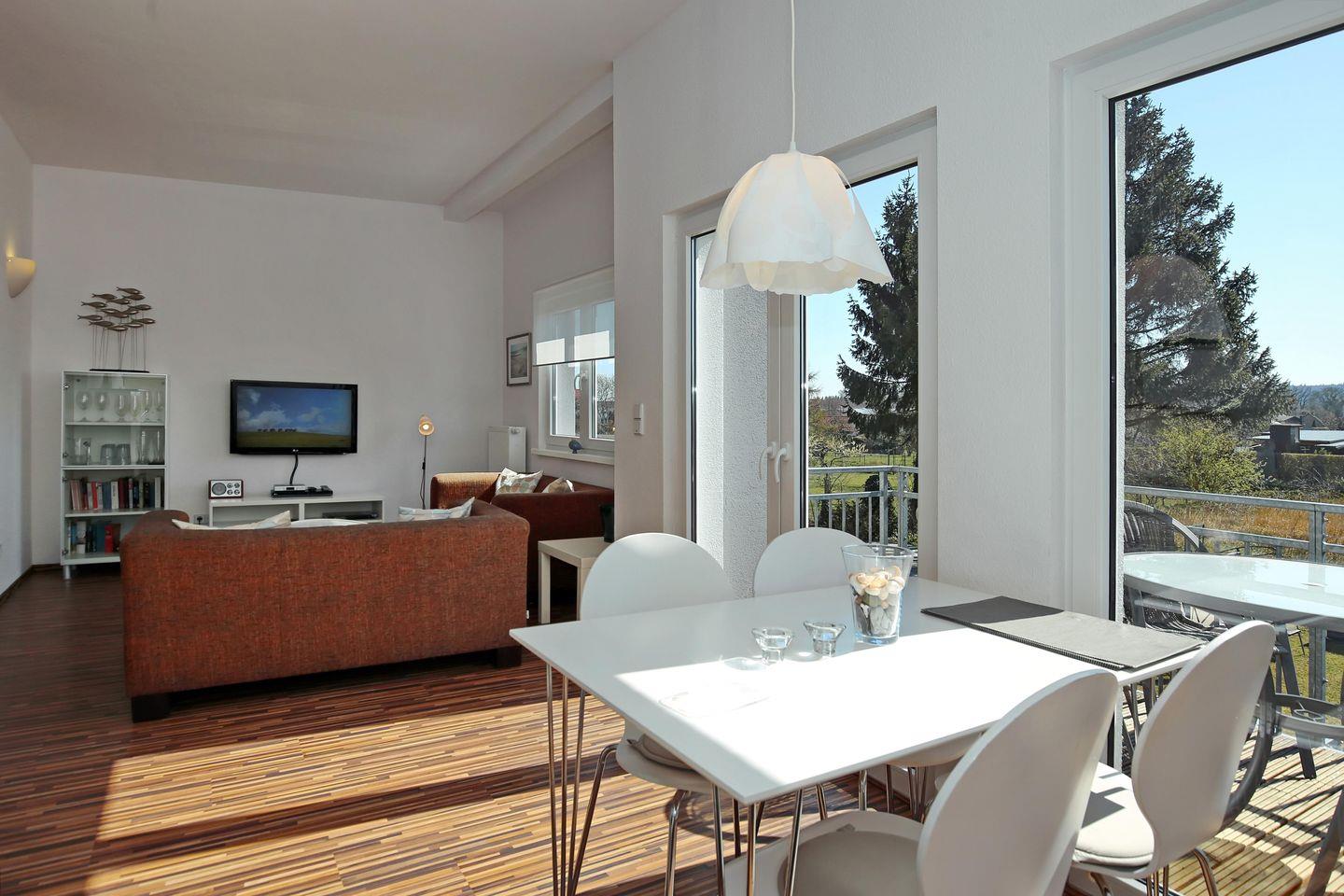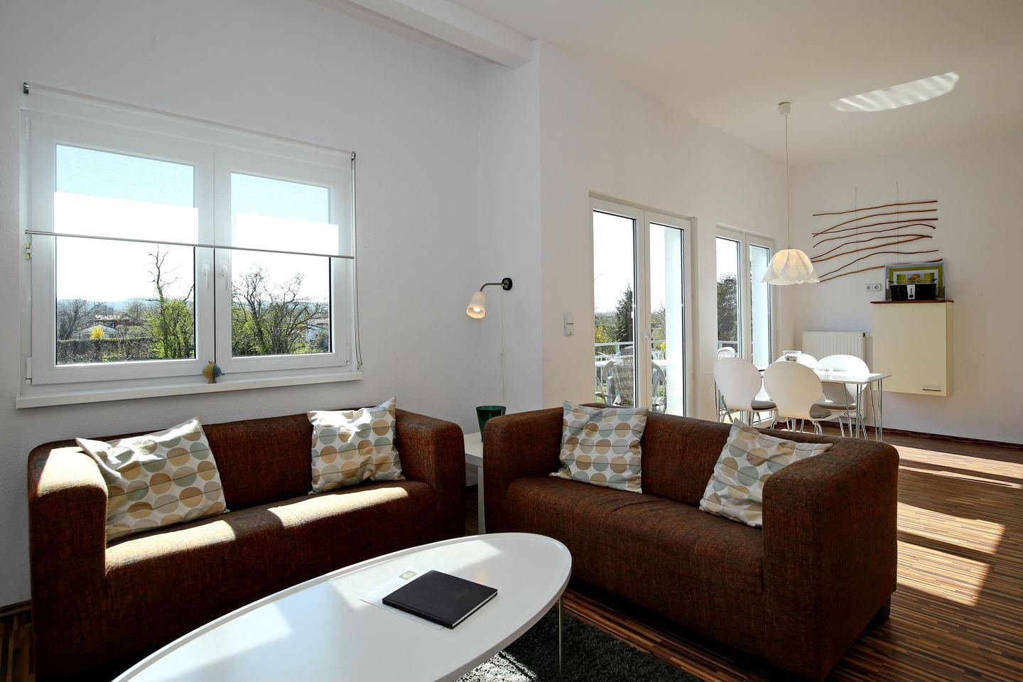 Im Wohnraum der Ferienwohnung warten auf dich zwei gemütliche Sofas, sowie ein moderner Flachbild-TV. Am Esstisch hast du genügend Platz für gemeinsame Mahlzeiten.