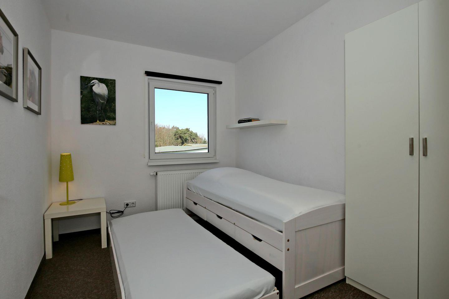 In dem ersten Schlafzimmer der Ferienwohnung lädt ein gemütliches Doppelbett zum erholsamen Schlaf ein. Eine Kommode bietet hier Stauraum. Im zweiten Schlafzimmer findest du ein Tandembett vor. Ein Kleiderschrank bietet dir hier genügend Stauraum für deine Urlaubsgarderobe. Rollos an den Fenstern dienen dir zur Verdunklung.