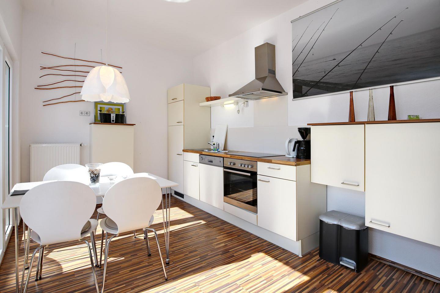 Die offene Küchenzeile ist mit einem Kühlschrank mit Gefrierfach, einem Geschirrspüler, einem 4 Platten Cerankochfeld und einem Backofen ausgestattet. Natürlich stehen dir ein Toaster, ein Wasserkocher und eine Kaffeemaschine zur Verfügung. Von hier aus kommst du auf den möblierten Balkon mit Blick in den Garten.