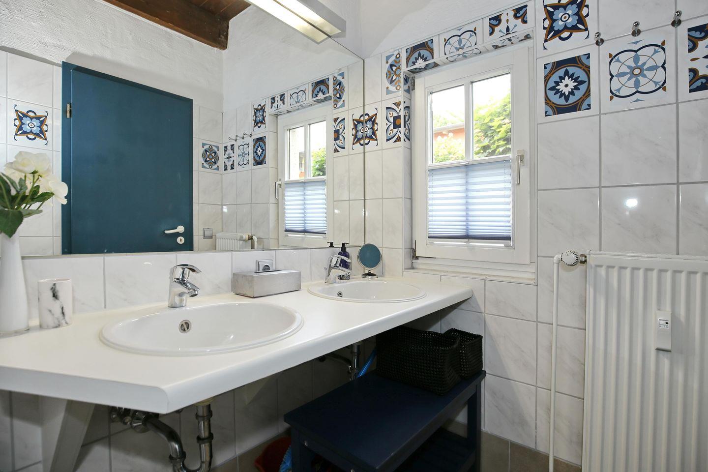 Das Tageslichtbad verfügt über eine Dusche und ein WC. Über dem Doppelwaschtisch hängt ein großer beleuchteter Spiegel. Als Sichtschutz kannst du die vorhandenen Vorhänge nutzen. Das Bad und der kombinierte Wohn- und Essbereich sind gefliest. In der Sitzecke sorgt ein großer Teppich für Behaglichkeit. Im Schlafzimmer wurde Laminat verlegt.