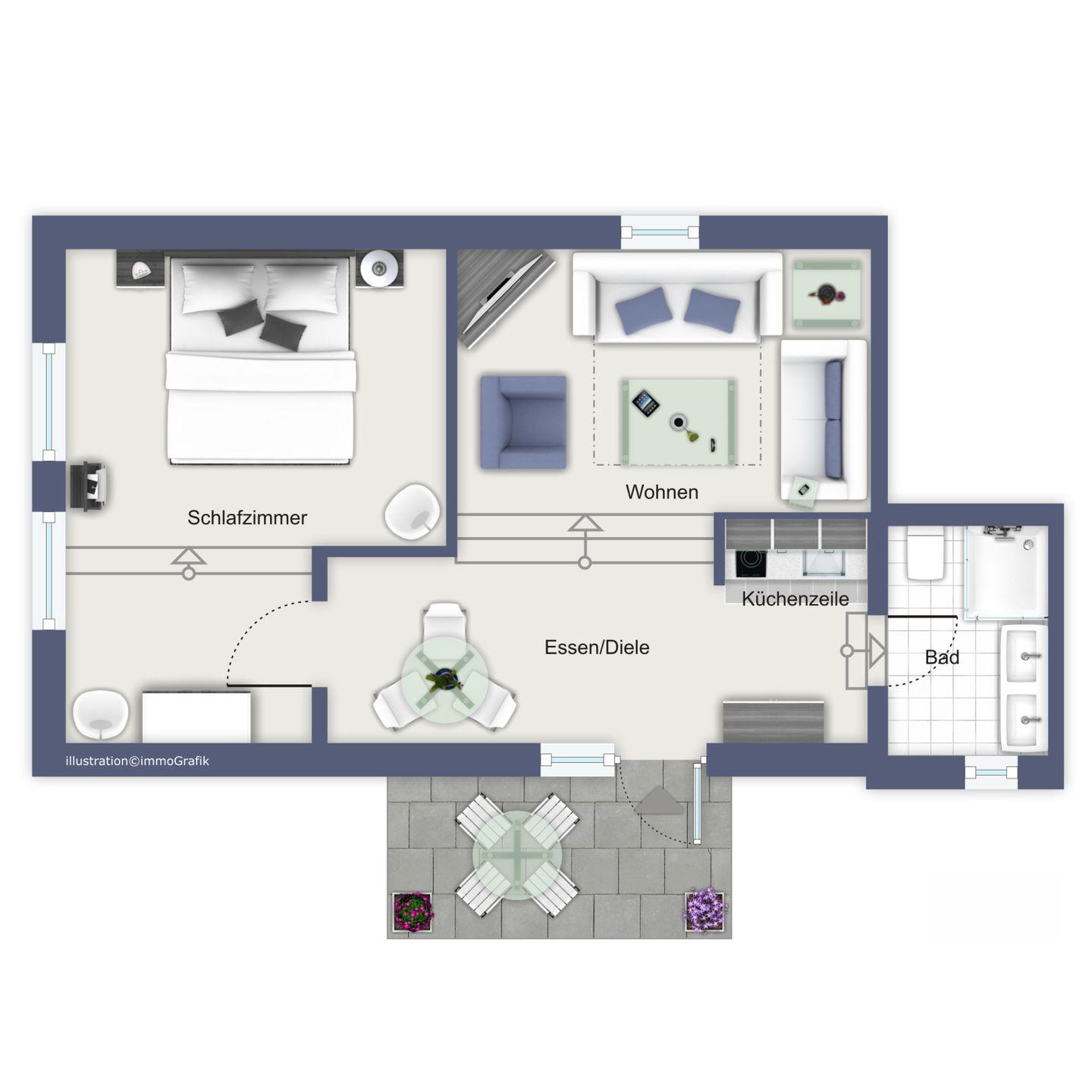 Die 2-Zimmer-Ferienwohnung 14 „Auf den Höfen“ mit 41 m² für bis zu 3 Personen befindet sich im Erdgeschoss und verfügt über eine kleine Terrasse.