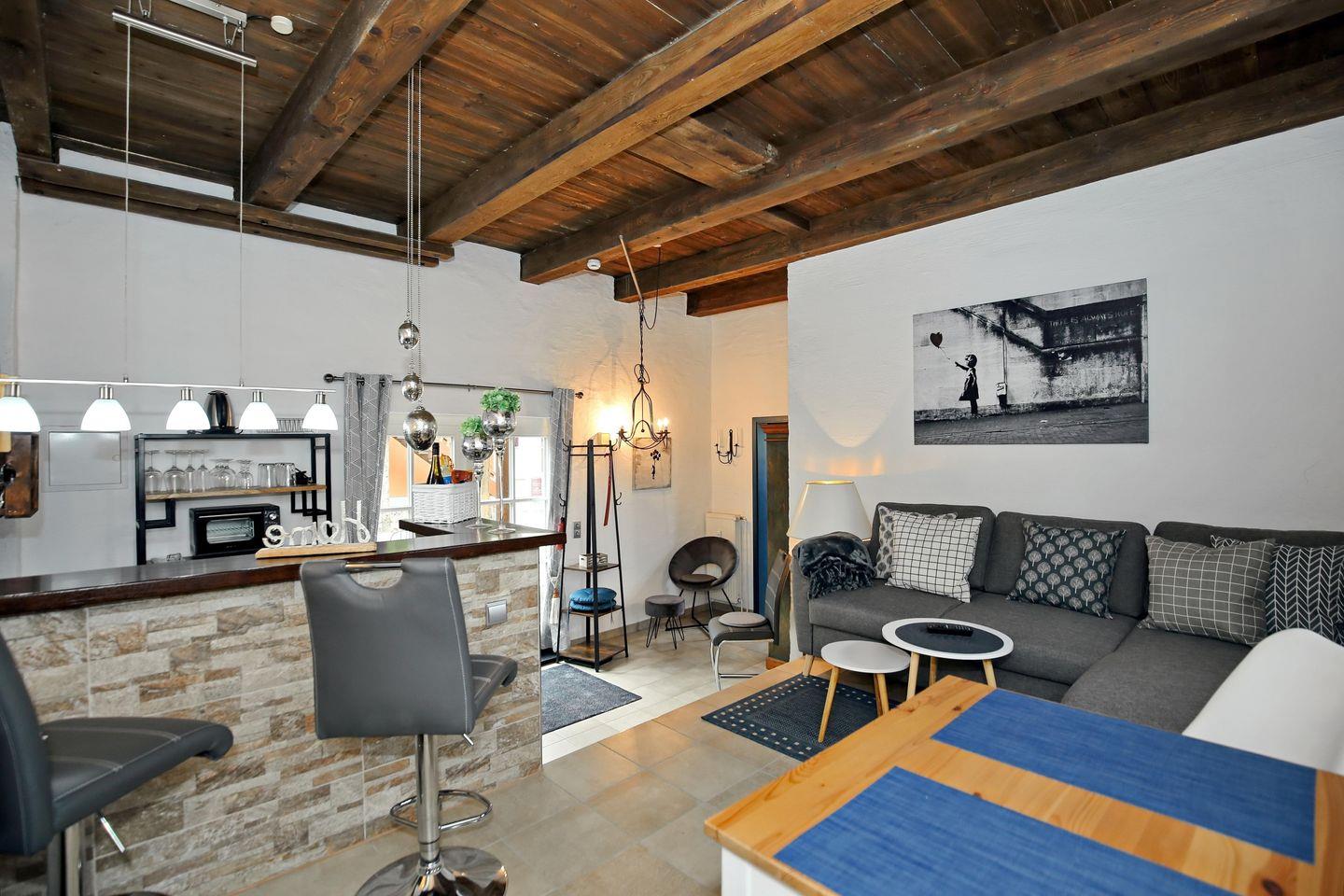 Der Wohnbereich der Ferienwohnung lädt zum Verweilen ein. Ausgestattet mit einer Couch, einem Sessel, einer Stereoanlage sowie einem Flachbild-TV, kannst du hier gesellige Abende verbringen. Der integrierte Essbereich bietet dir die Möglichkeit, gemeinsam eure Mahlzeiten zu genießen.