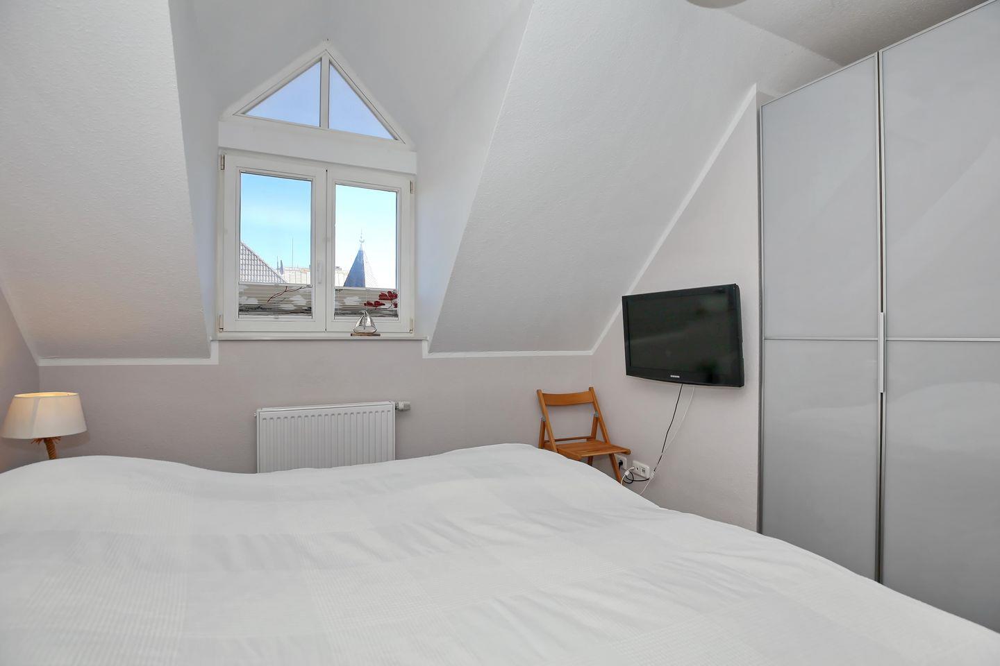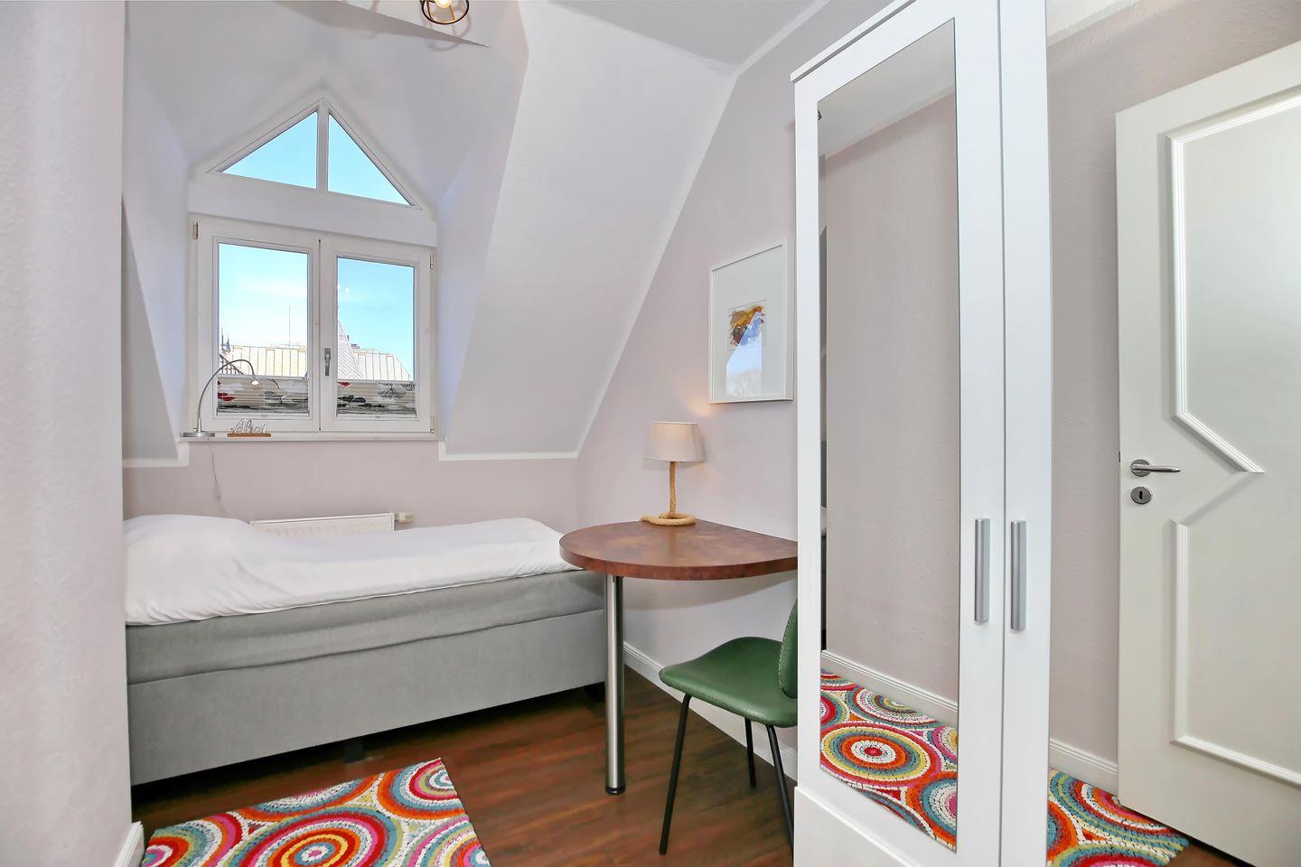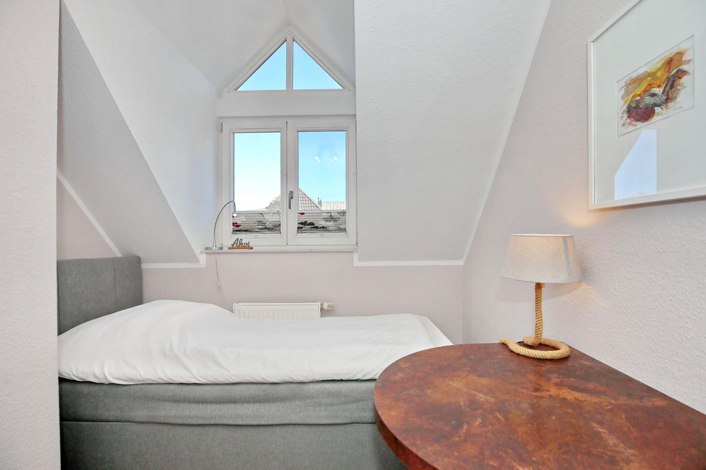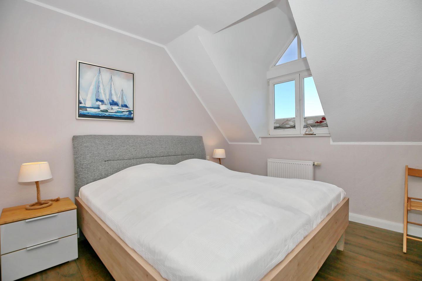 Im ersten Schlafzimmer der Ferienwohnung erwarten dich ein gemütliches Doppelbett mit 2 Matratzen (90 x 200 cm) und ein 2. TV. Ein Kleiderschrank bietet dir hier ausreichend Stauraum für deine Urlaubskleidung. Im 2. Schlafzimmer befindet sich ein modernes Boxspring-Einzelbett (100 x 200 cm) und ein kleiner Tisch mit Stuhl.