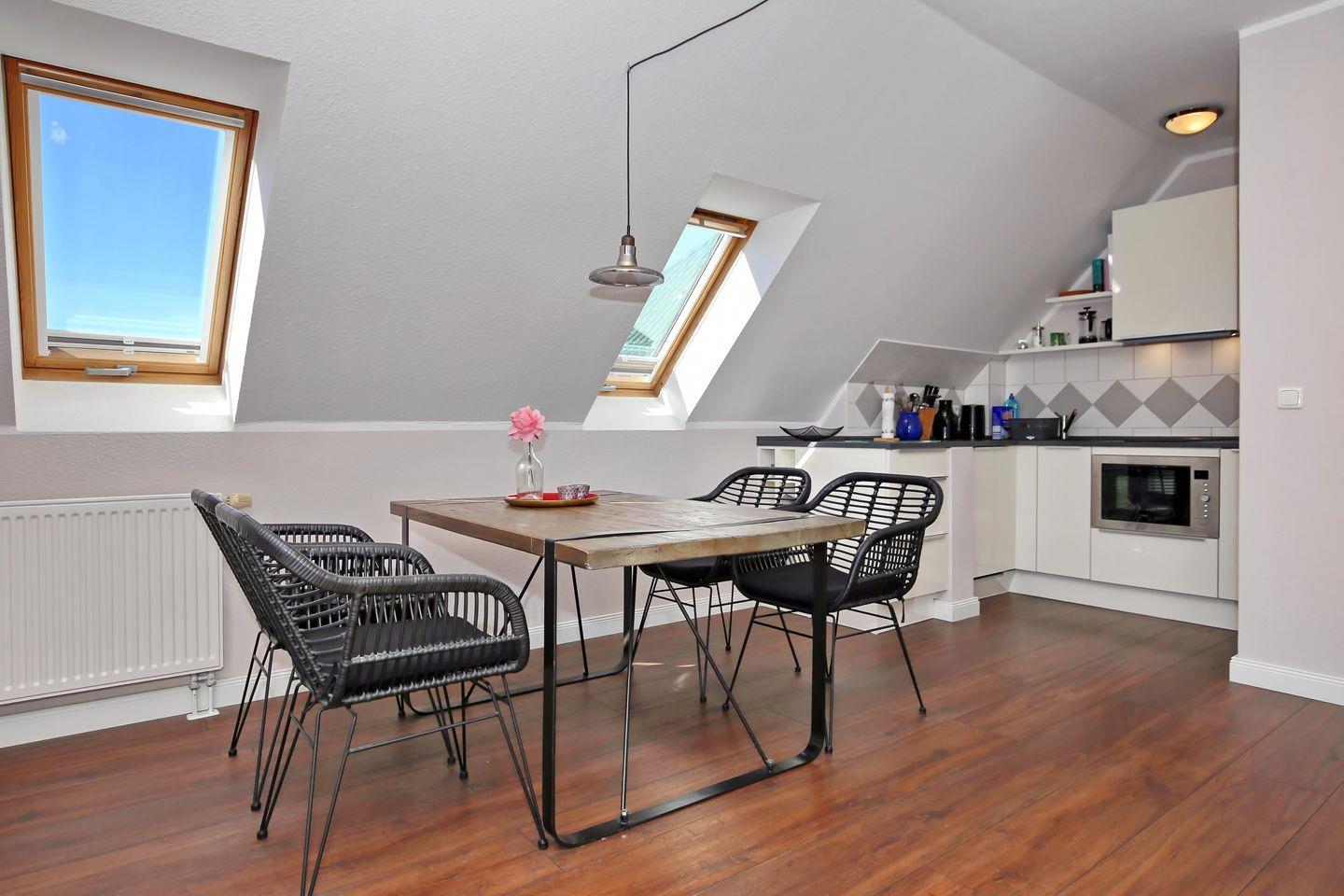 Zur offenen Küchenzeile gehört ein Kühlschrank mit Gefrierfach, ein 2-Platten-Ceran-Kochfeld, ein Backofen (integriert in der Mikrowelle) sowie ein Geschirrspüler. Selbstverständlich findest du außerdem Wasserkocher, Toaster und Kaffeemaschine vor.