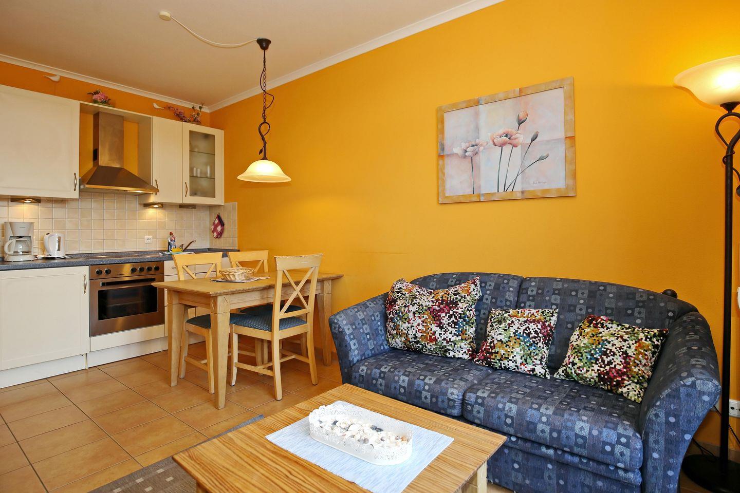Im Wohnbereich der Ferienwohnung laden euch eine Couch, zwei Sessel, ein Blu-ray-Spieler, Bücher sowie ein Flachbild-TV und ein Radio zu entspannten Urlaubsabenden ein. Der integrierte Essbereich bietet euch viel Platz für gemeinsame Mahlzeiten.