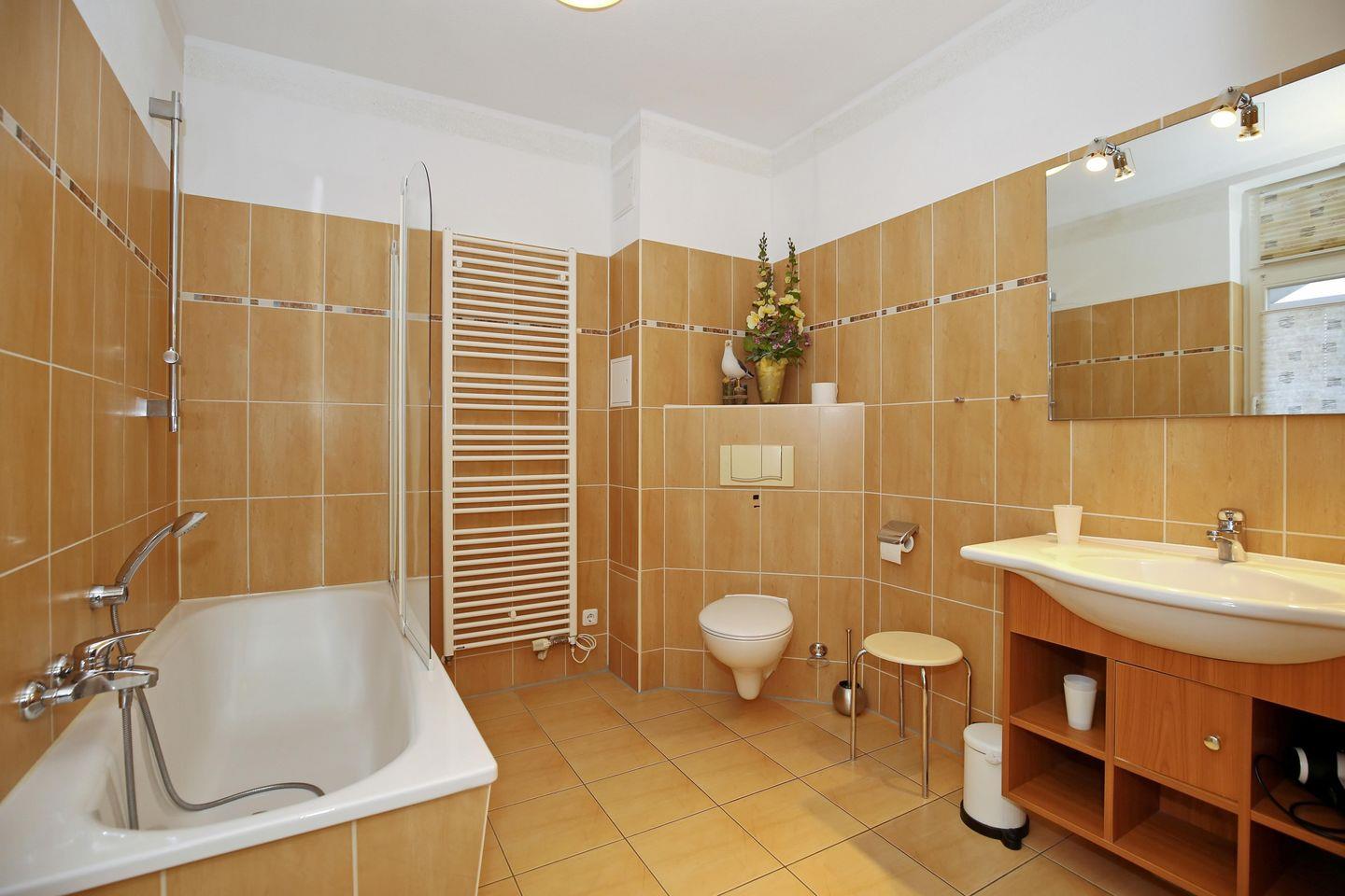 Das geräumige Tageslichtbad verfügt über eine Badewanne mit Duschfunktion und ein WC. Für eure Waschutensilien gibt es Stauraum am Waschtisch. Die Badeinrichtung wird durch einen beleuchteten Spiegel sowie einen Föhn und einen Kosmetikspiegel ergänzt. In der gesamten Wohnung sind Feinsteinfliesen verlegt.