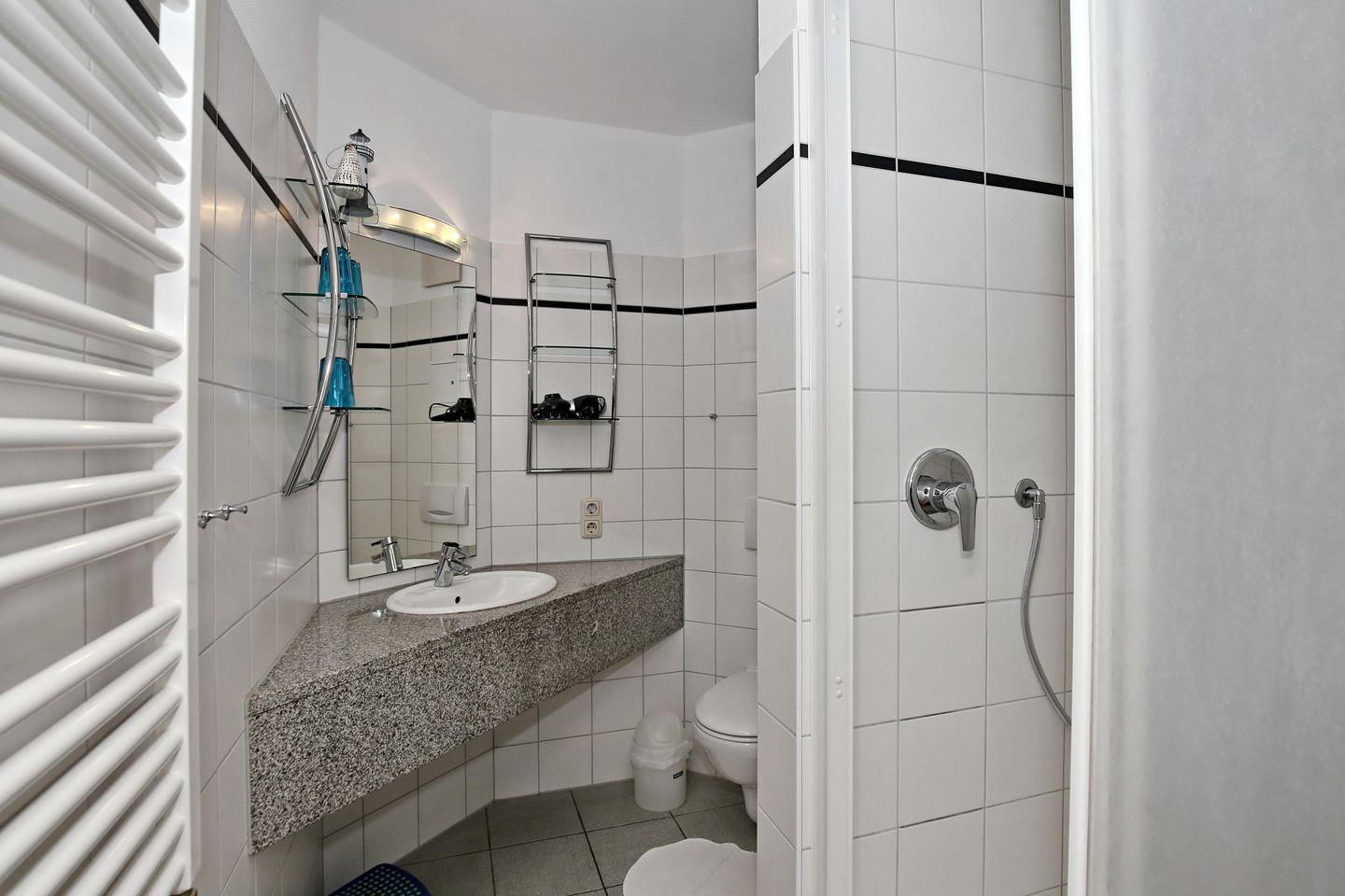 Das Bad der Ferienwohnung ist für dich mit einer Dusche, einem WC und einem Föhn ausgestattet.
