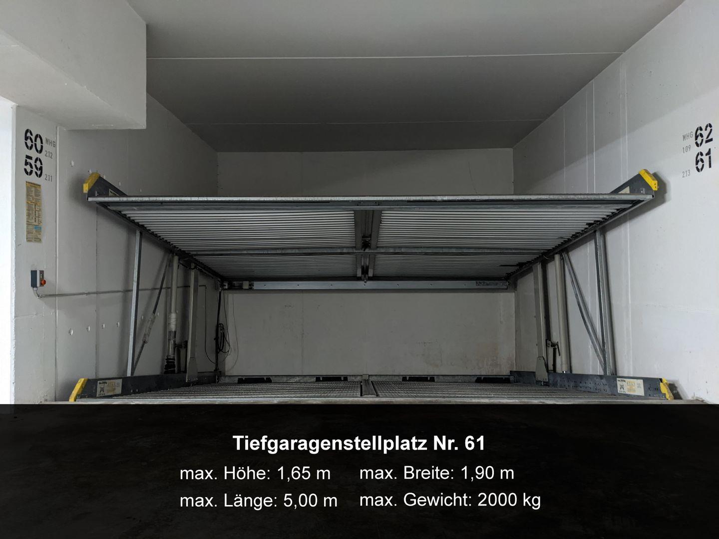 Zur Ferienwohnung gehört der Kfz-Stellplatz Nr. 61 in der Tiefgarage (max. Höhe 1,65 m, max. Gewicht 2.000 kg).