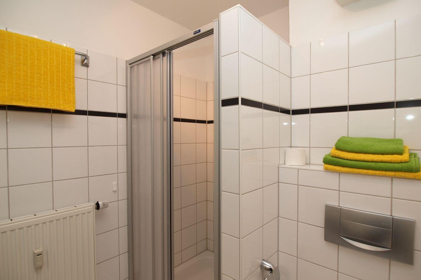Die Ferienwohnung verfügt über ein gefliestes Duschbad mit WC und Föhn. In der restlichen Ferienwohnung wurde ein Vinylboden verlegt.