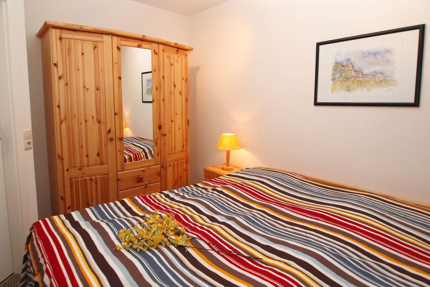 Im Schlafzimmer dieser Ferienwohnung lädt dich ein Doppelbett (2 x 90 x 200 cm) zum erholsamen Schlaf ein. Ein Kleiderschrank bietet viel Stauraum. Plissees und Vorhänge dienen zum Verdunkeln (das Schlafzimmerfenster geht zum Atrium raus).