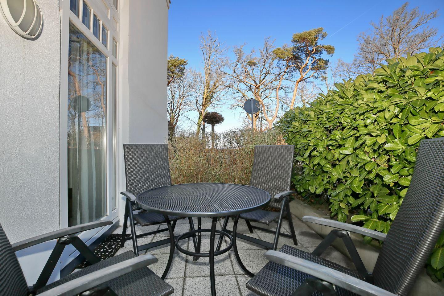 Die 2-Zimmer-Ferienwohnung 07 im EG + 1.OG des Hauses Miramare bietet auf 60 m² Platz für 4 Personen. Von der Terrasse aus haben Sie in den vegetationsarmen Jahreszeiten teilweise einen seitlichen Blick auf die Ostsee. Das Haus verfügt über Münzwaschmaschine und –trockner.