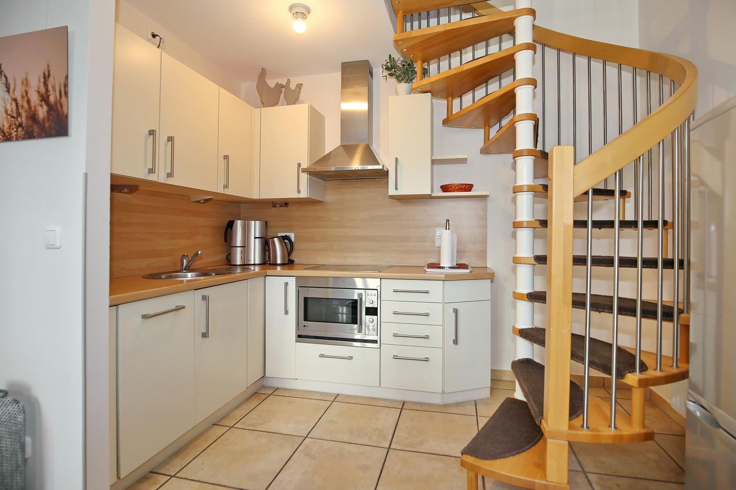 Ebenfalls im Erdgeschoss befindet sich die offene und gut ausgestattete Küchenzeile. Zur Kücheneinrichtung gehören ein Kühlschrank mit Gefrierfach, ein 4-Platten-Cerankochfeld, ein Geschirrspüler, ein Wasserkocher, eine Kaffeemaschine, ein Toaster und eine Mikrowelle.