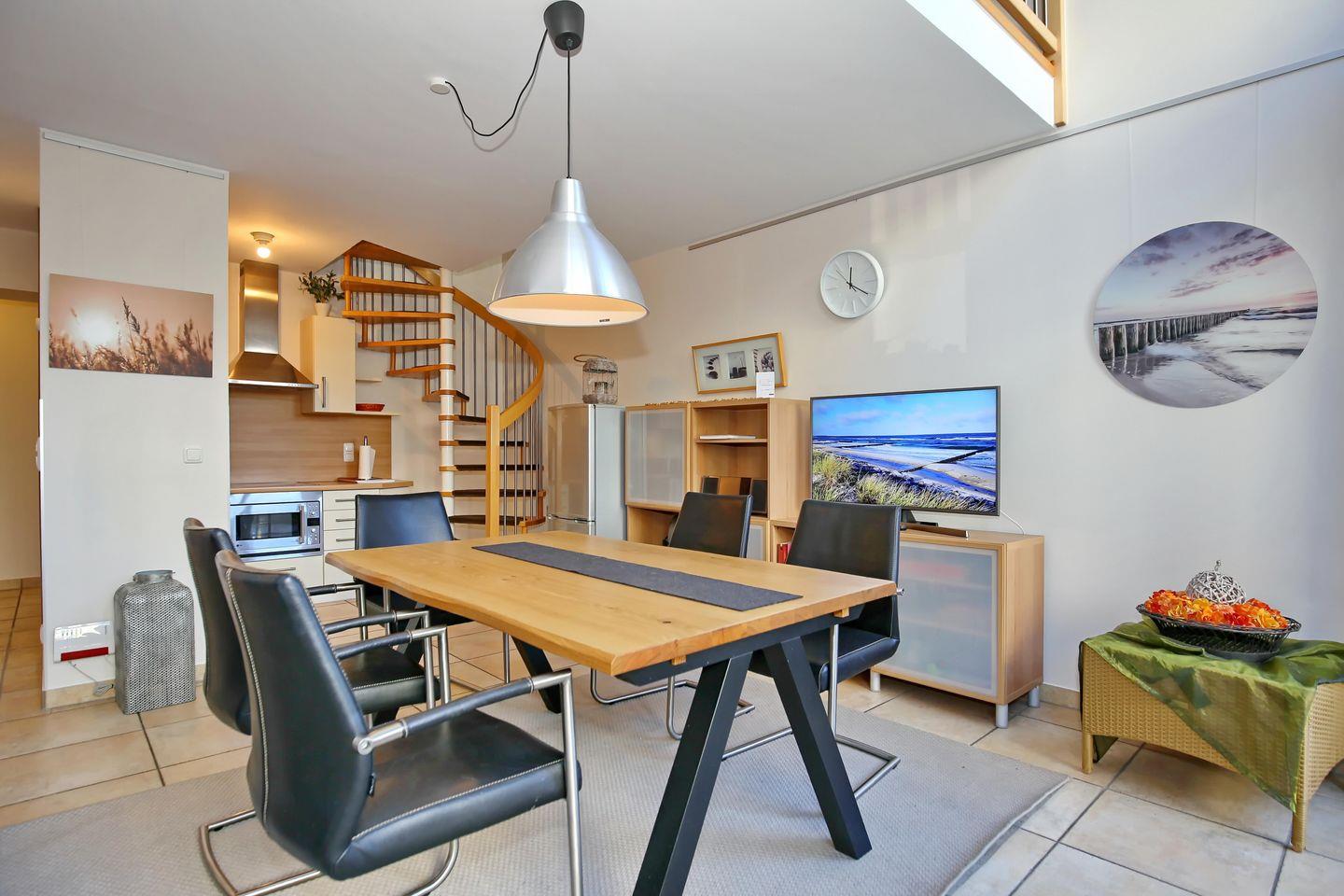 Der Essbereich im Erdgeschoss der Ferienwohnung ist gefliest und lädt dich mit hellen und freundlichen Farben, einem großen Esstisch und einem Flachbild-TV zu gemütlichen Mahlzeiten ein. Für die kleinen Gäste steht ein Hochstuhl bereit. Die Terrasse mit Ost-Ausrichtung kannst du vom Essbereich erreichen.